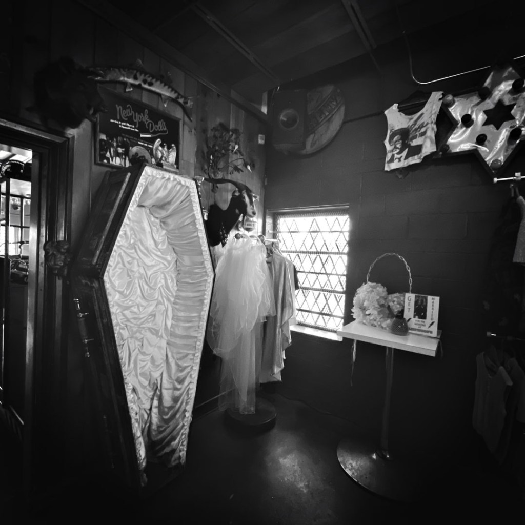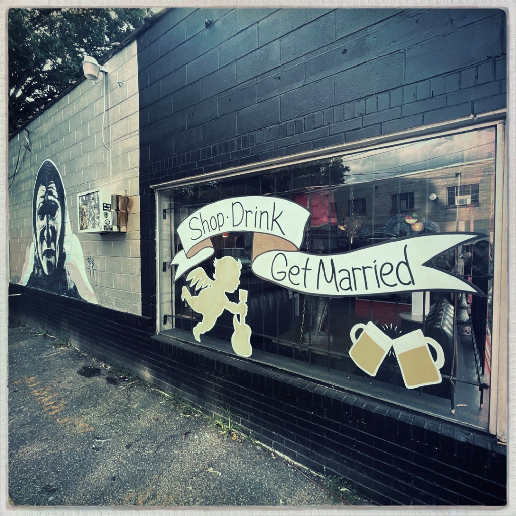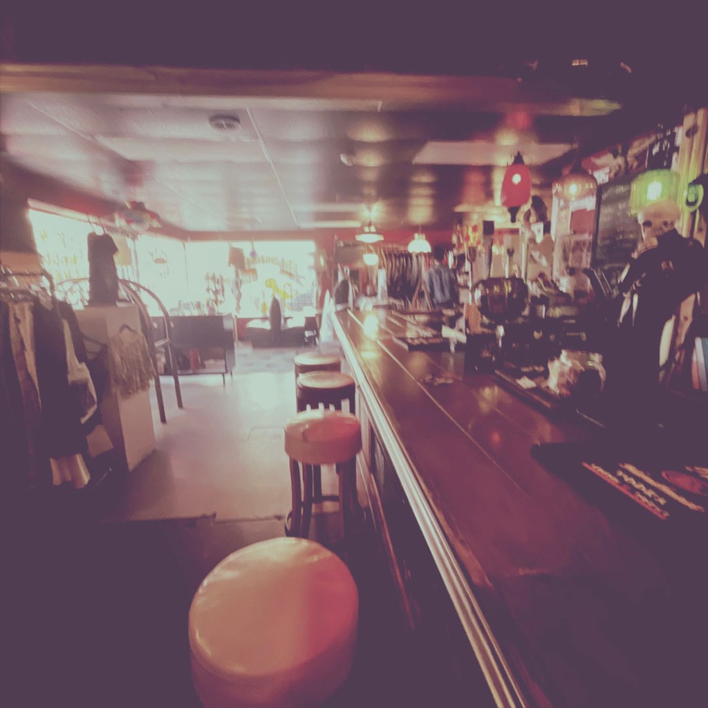 Et ensuite, on remonte la rue principale, pour trouver un bar. J’avais repéré un truc un peu rigolo, qui fait bar/friperie/chapel pour le marier le weekend.