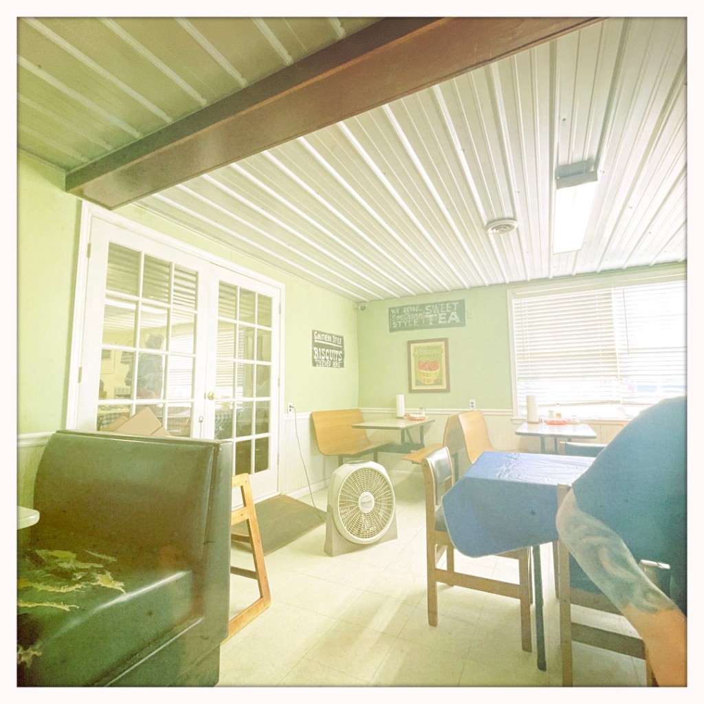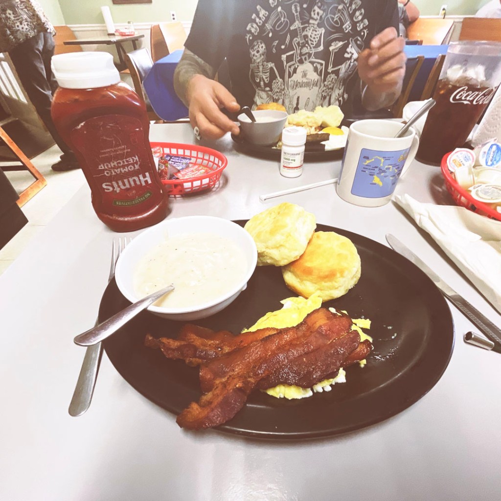 On par de notre Airbnb formidable(hier, on a même rencontré leur deux chiens, des danois géants qui bavent), on dit au revoir aux oiseaux (y’avait des BUSES dans leur jardin) et on hit the road. J’ai vu qu’on moins d’une heure de route y’a un endroit un peu à l’ancienne pour un petit dej dans un micro bled. Quand on arrive, y’a que des pickup garés devant. Théoriquement, les tarifs était imbattable. 1,50$ l’oeuf, 4,50$ les biscuits and gravy. On donne une carte sans prix, et finalement, à l’arrivée ça fait 23$ pour deux, ce qui n’est pas tant moins que dans les endroits plus exotiques chics. Tant pis, c’était pas mal, mais pas ouf. (le gravy, c’était clairement du gravy mix, soit une poudre qu’on trouve au supermarché).
