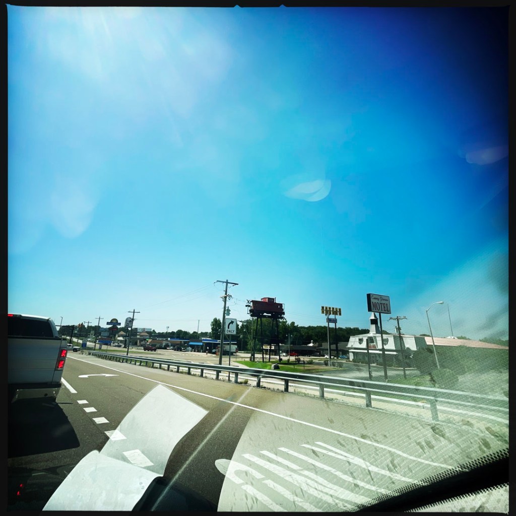 ensuite c’est la route. On fait la premère partie sur une grosse artère, jusqu’à Jackshon, et pour la suite, sur la route de Memphis, on opte pour l’itinéraire bis. Ça rajoute un peu, mais ça permet de voir toutes les églises de Jésus, de Dieu et ses pots. C’est bien mieux. Finalement, on est un peu Saint Jacques de Compostelle au ketchup.