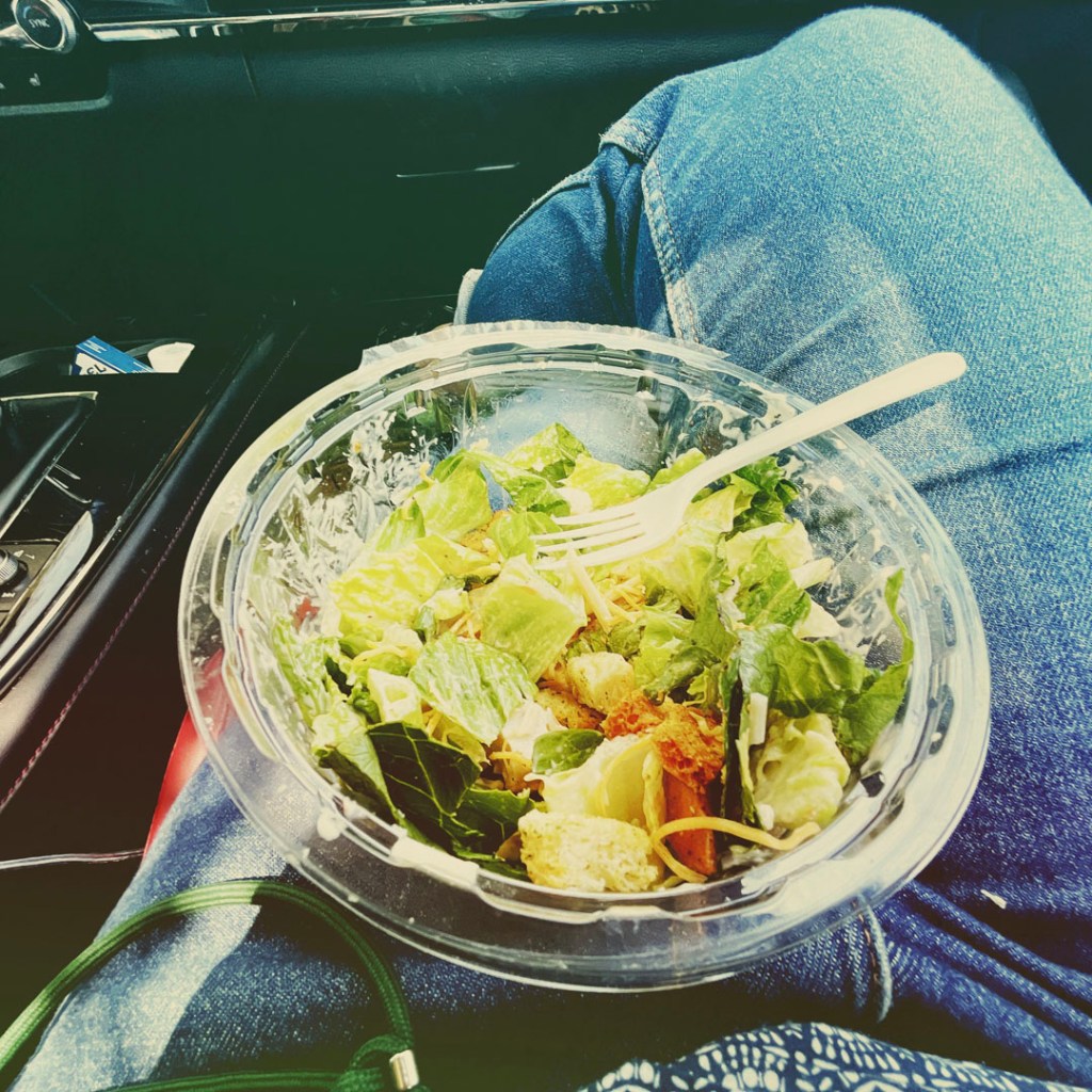 On s’arrête dans un supermarché pour manger une salade en plastique. Pas ouf, pas cher.