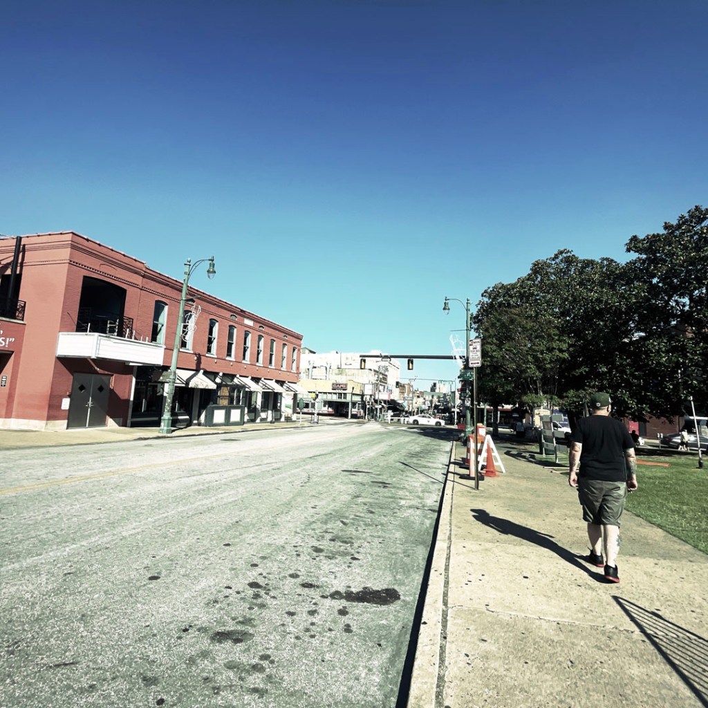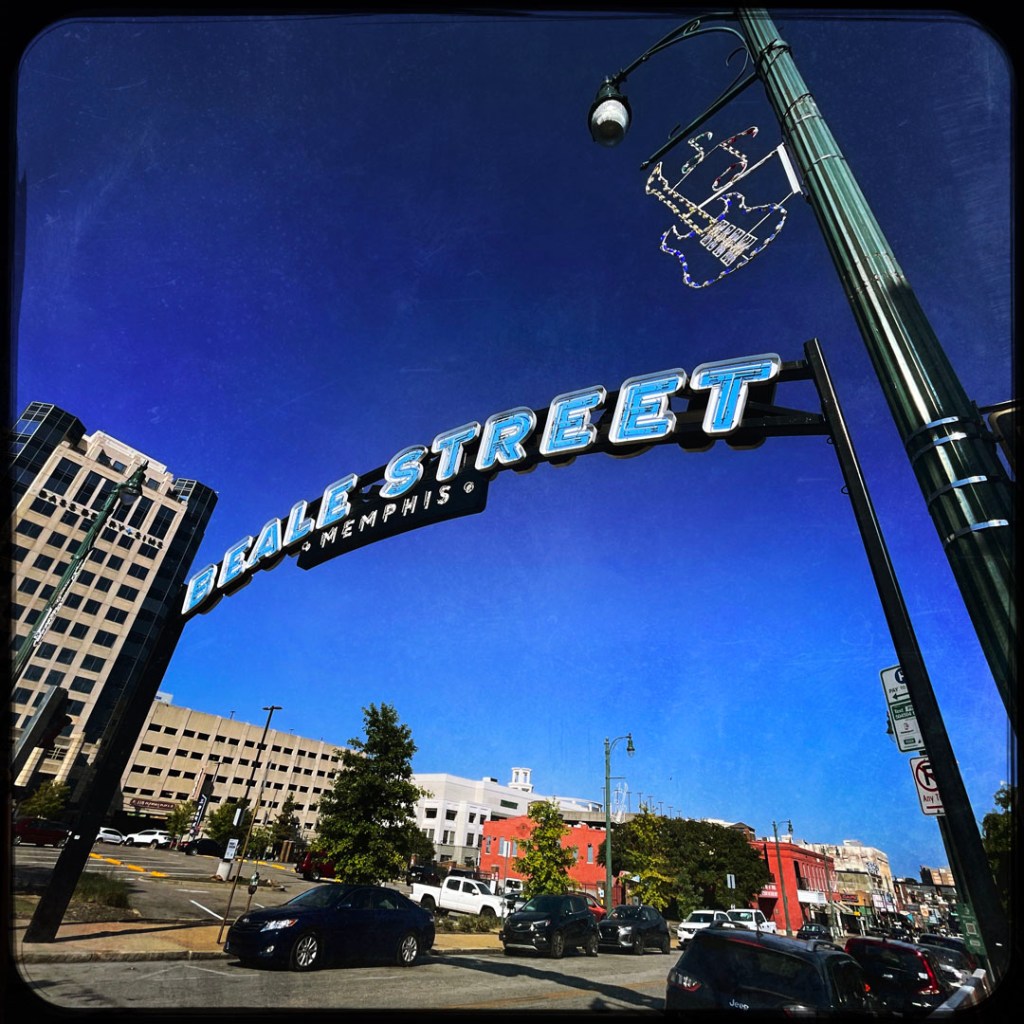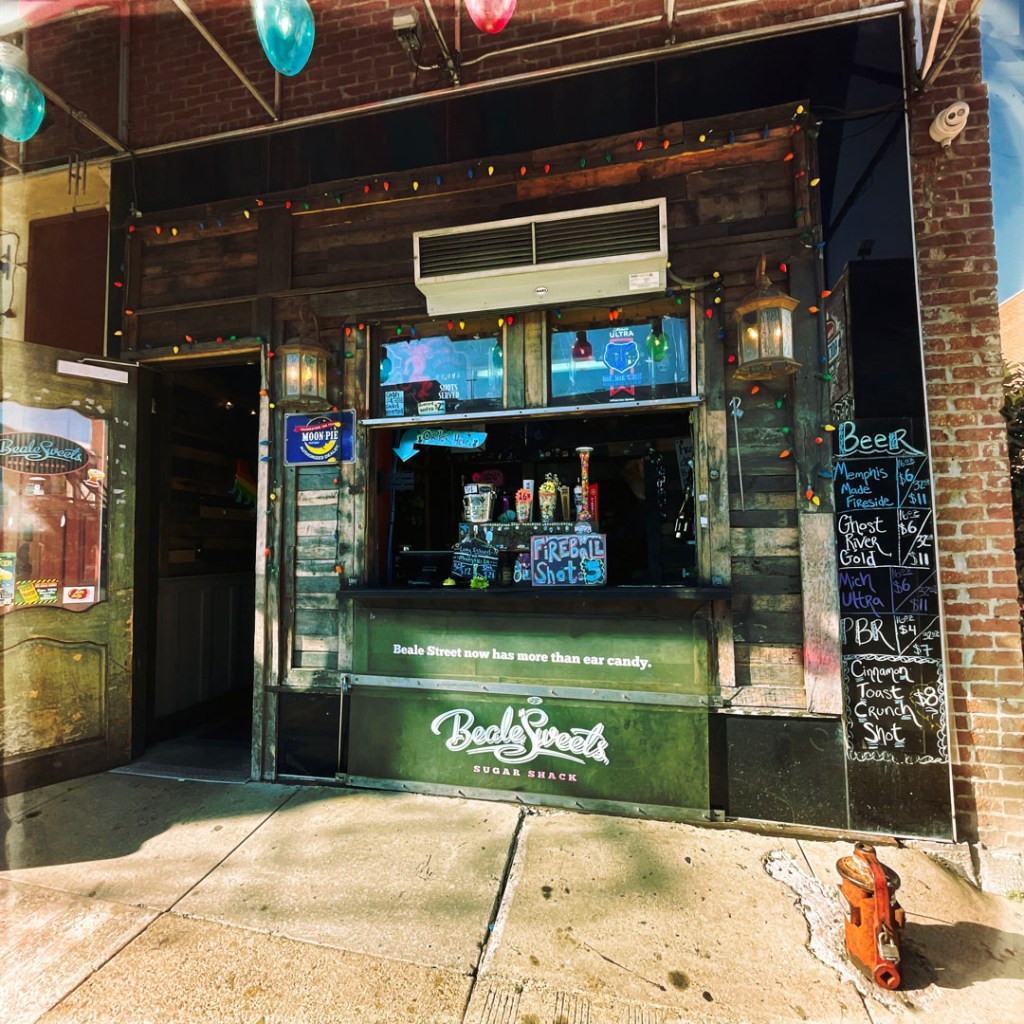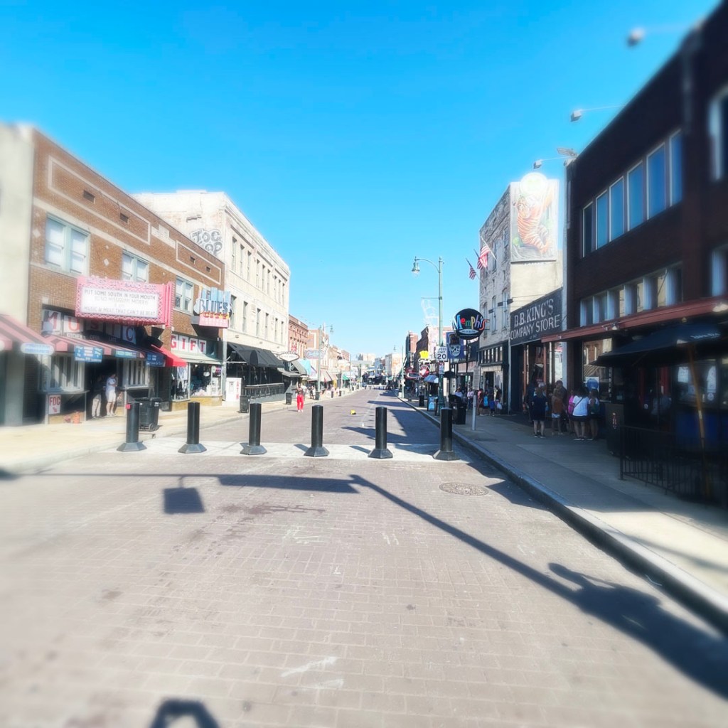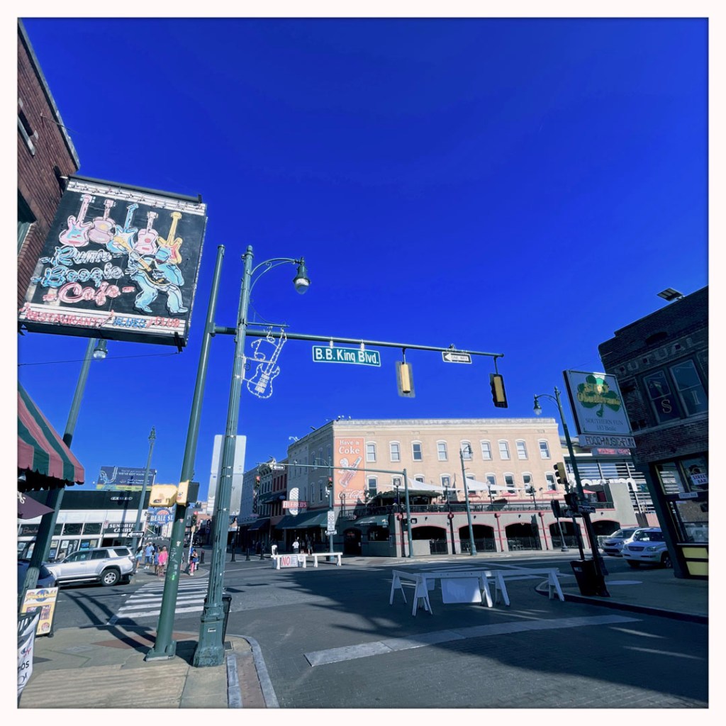 On se gare, et on arrive devant l’arche qui annonce cette rue interdite aux voitures. C’est pareil que Broadway, mais avec personne (bon, ok, il est 17h) mais la veille à Nashville, à la même heure voir plus tôt, c’était déjà le bordel. C’est le même principe, un bar, une vitrine ouverte et de la musique. Mais : y’a du blues pour de vrai, de la P-Funk (je suis une inconditionnelle fan de Parliament/Funkadelic). À la place de Sweet home Alabama, y’a Atomic dog et We want the funk. je suis réjouie. J’ai de la place pour faire des photos, et je réitère : il fait chaud.
