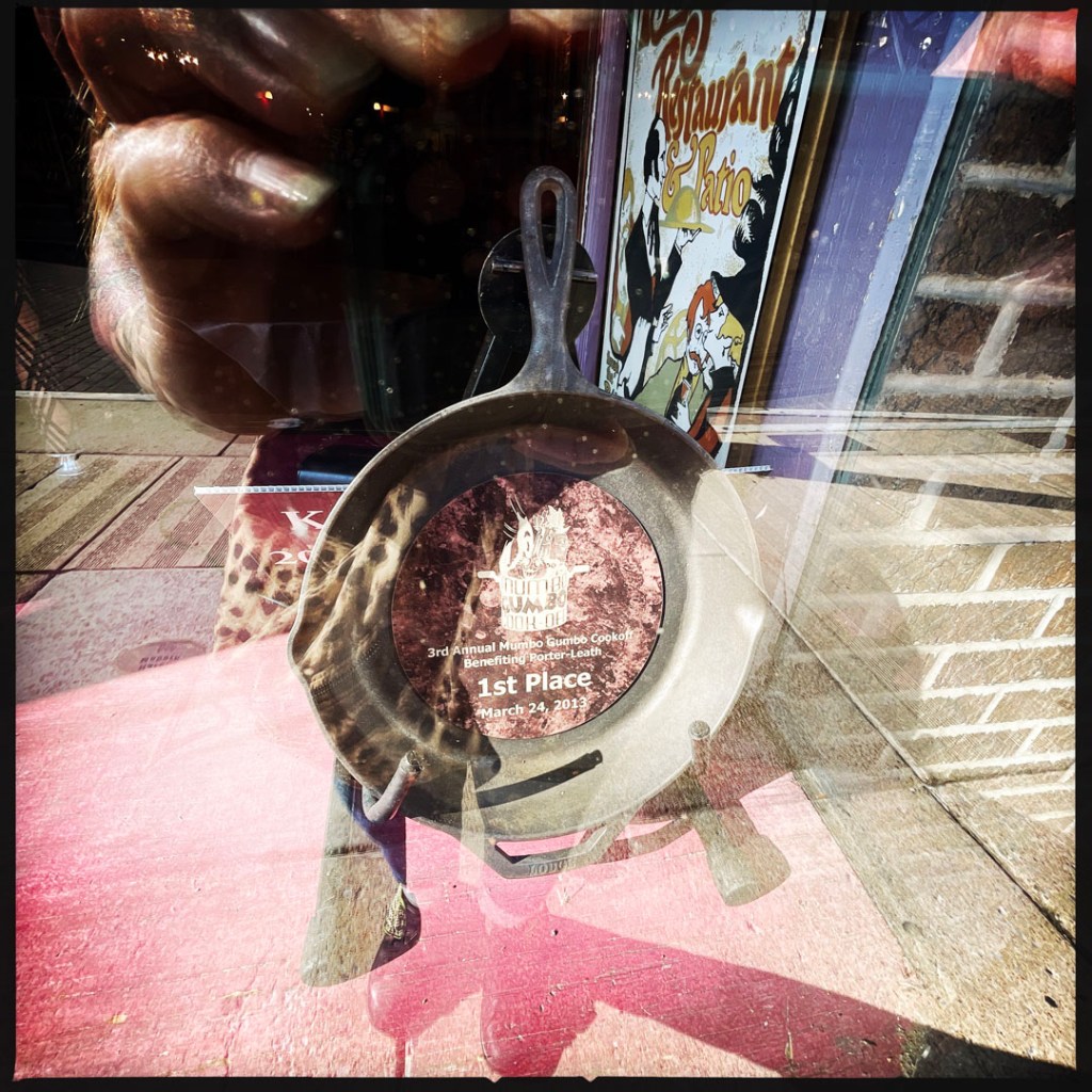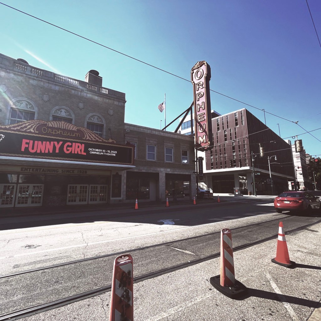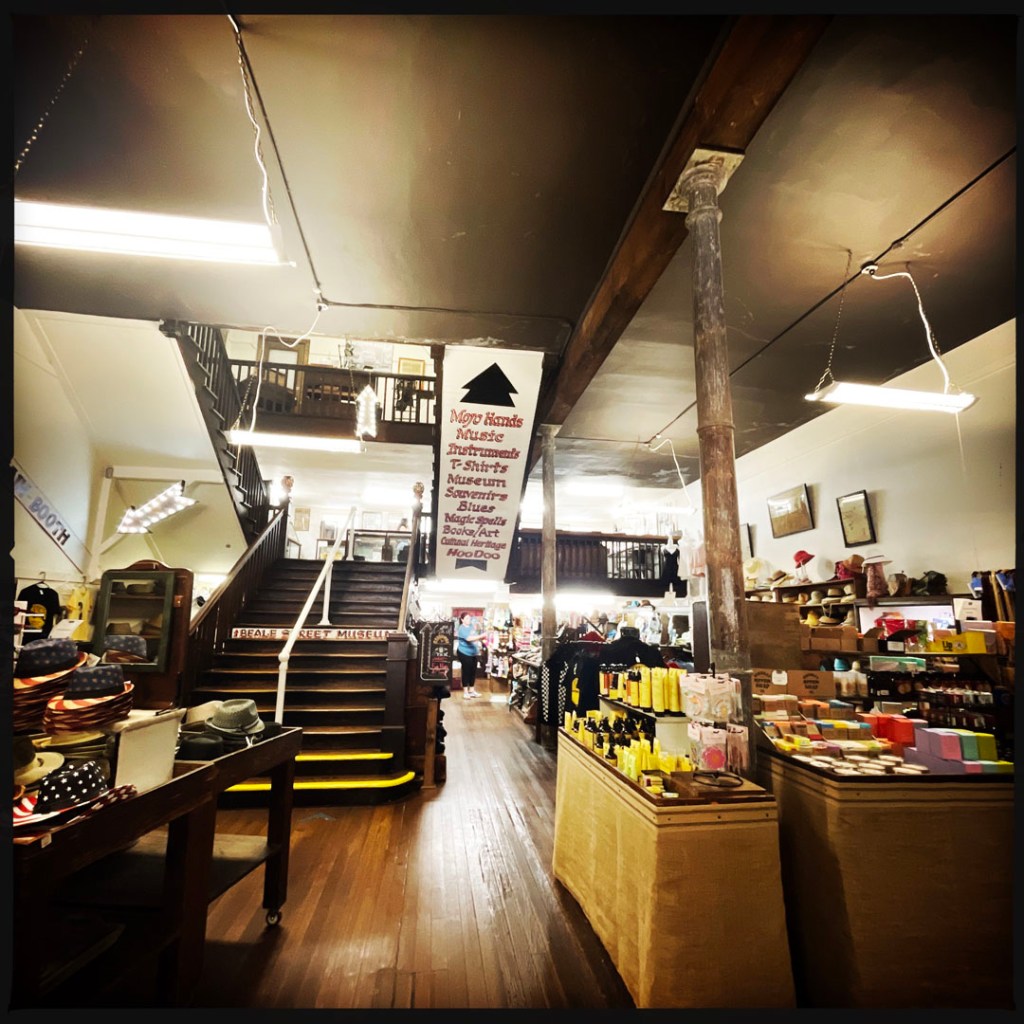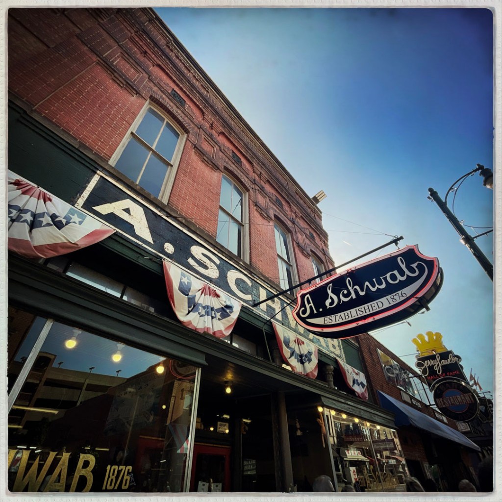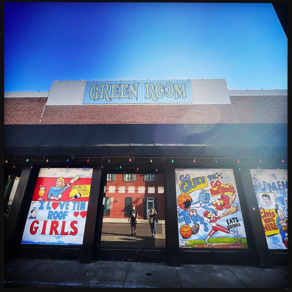 On se gare, et on arrive devant l’arche qui annonce cette rue interdite aux voitures. C’est pareil que Broadway, mais avec personne (bon, ok, il est 17h) mais la veille à Nashville, à la même heure voir plus tôt, c’était déjà le bordel. C’est le même principe, un bar, une vitrine ouverte et de la musique. Mais : y’a du blues pour de vrai, de la P-Funk (je suis une inconditionnelle fan de Parliament/Funkadelic). À la place de Sweet home Alabama, y’a Atomic dog et We want the funk. je suis réjouie. J’ai de la place pour faire des photos, et je réitère : il fait chaud.