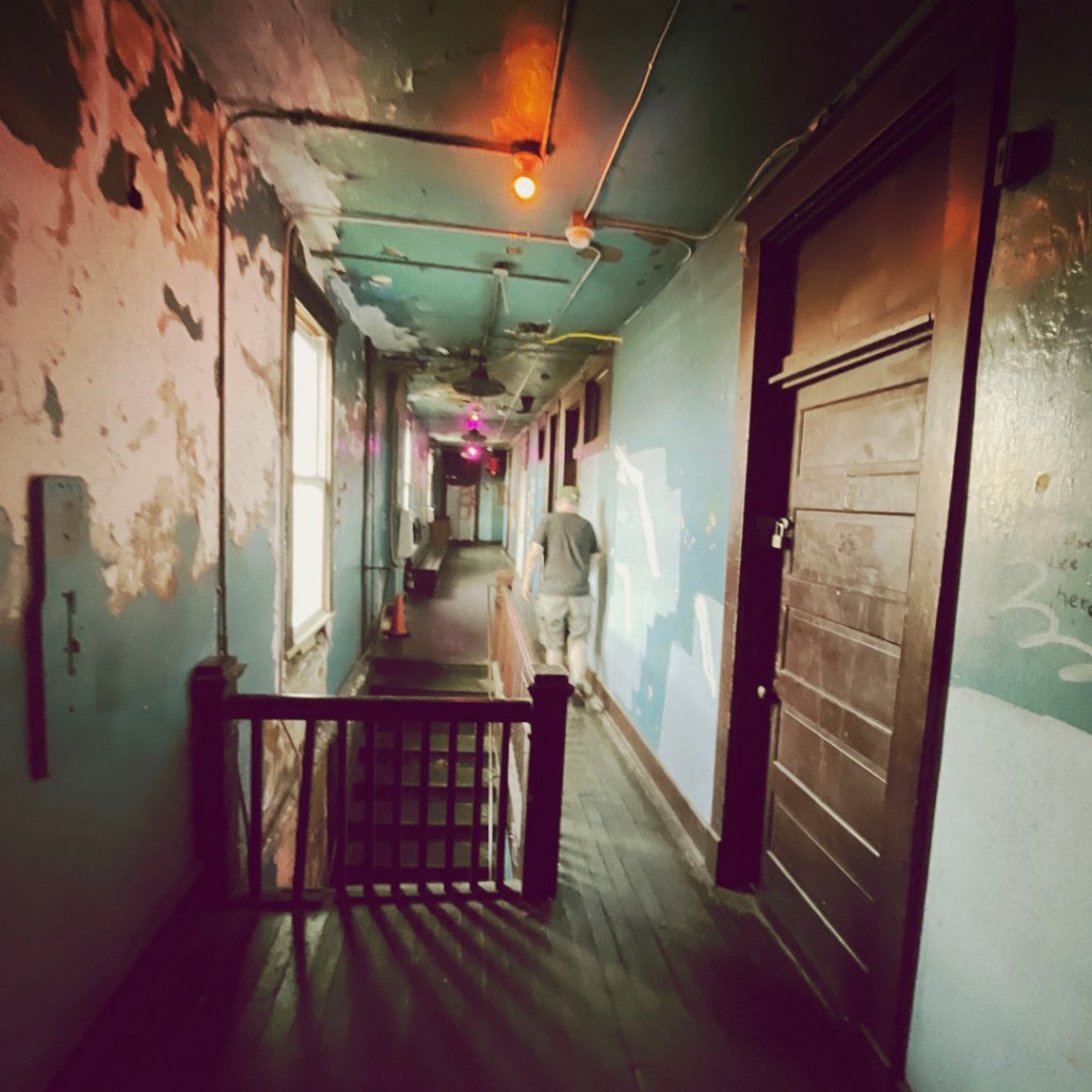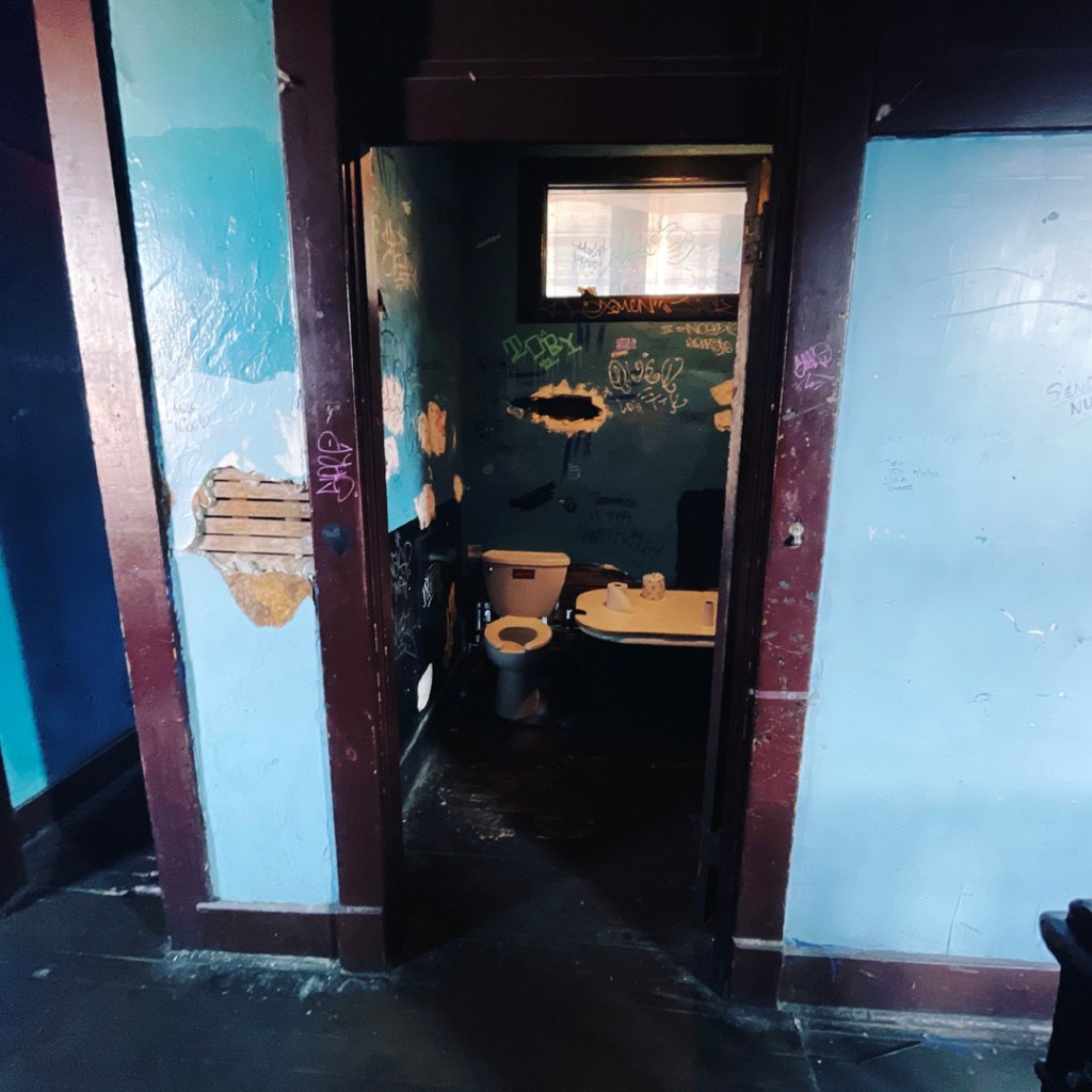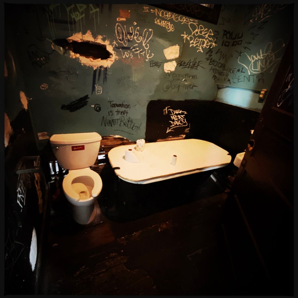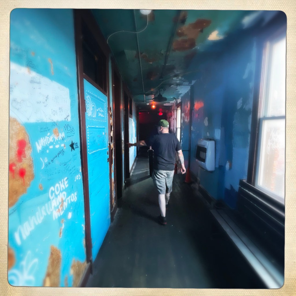 L’étage vaut le détour. C’est tout pourri, tout pété. y’a un couloir, avec des pièces déglinguées. Des toilettes avec des baignoires recouvertes. Des petits salons avec des meubles qui s’effondre. C’est super. Au bout du couloir, y’a un autre comptoir, c’est le bar de Nate, qui travaille là depuis la nuit des temps. Je vous mets un lien là avec toute l’histoire, au cas où. On n’ose pas trop s’attarder là : Nate discute avec des dames.