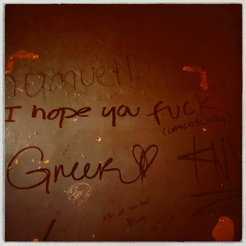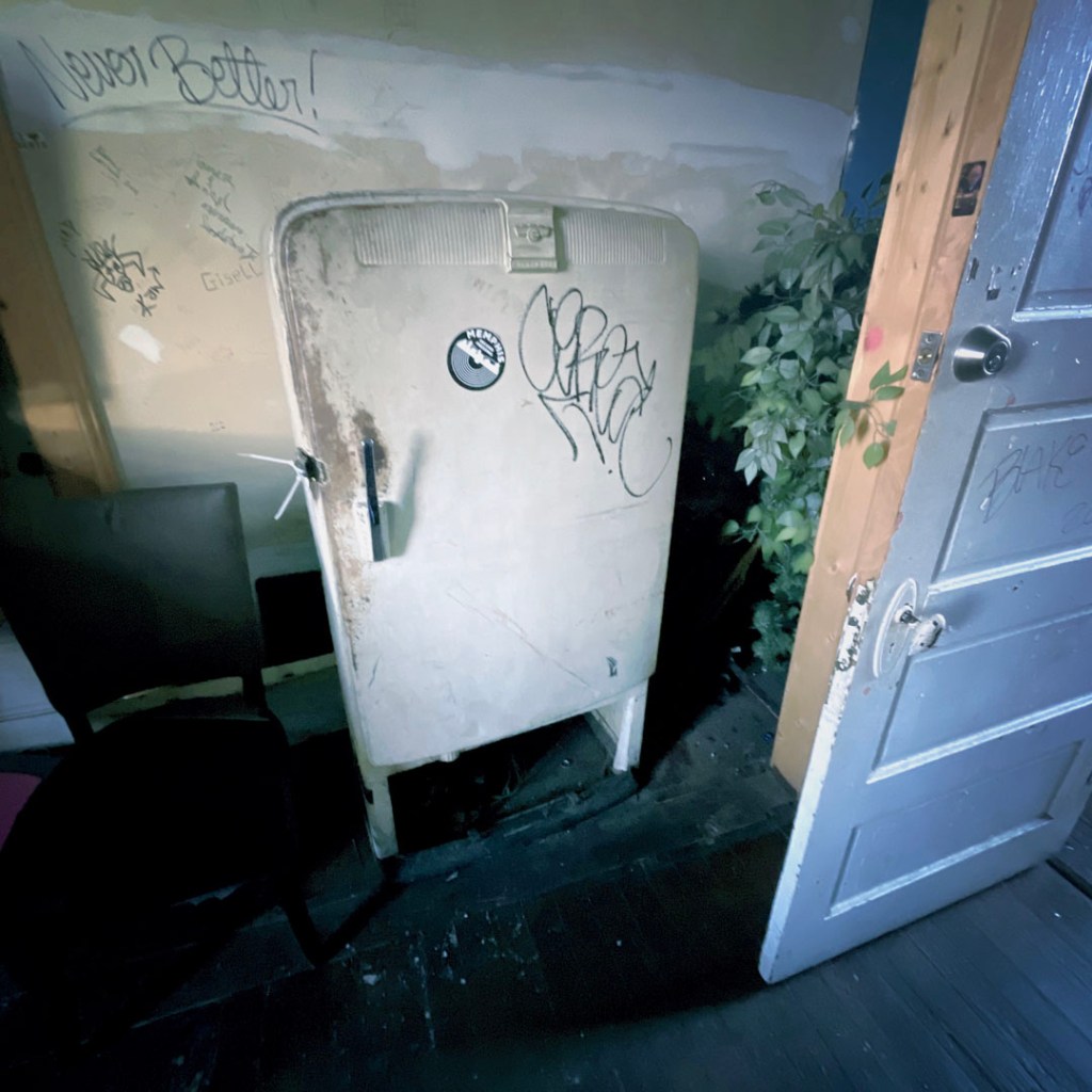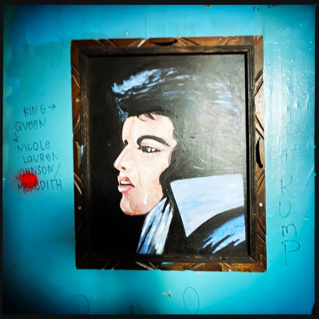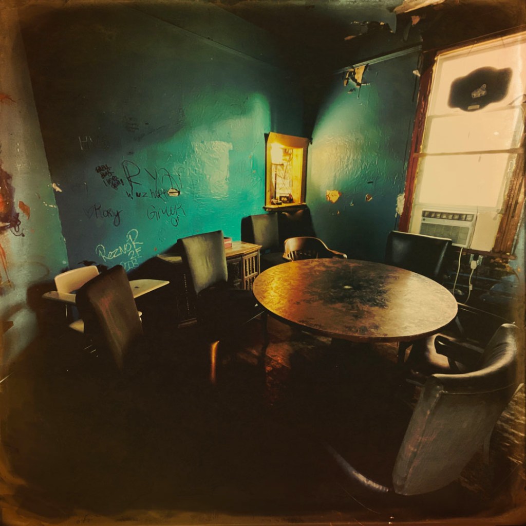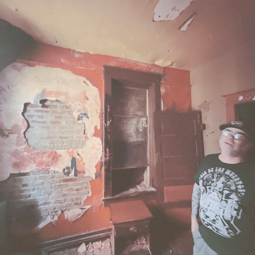 L’étage vaut le détour. C’est tout pourri, tout pété. y’a un couloir, avec des pièces déglinguées. Des toilettes avec des baignoires recouvertes. Des petits salons avec des meubles qui s’effondre. C’est super. Au bout du couloir, y’a un autre comptoir, c’est le bar de Nate, qui travaille là depuis la nuit des temps. Je vous mets un lien là avec toute l’histoire, au cas où. On n’ose pas trop s’attarder là : Nate discute avec des dames.