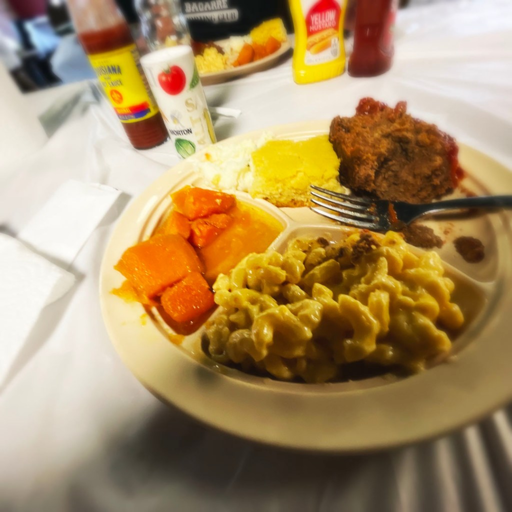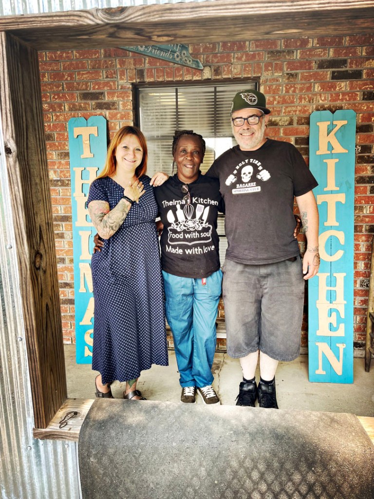 Y’a comme un stand de self, avec deux dames qui servent dans des plat en inox posés sur des flammes pour garder chaud. Du meatloaf, du poulet, des chicken wings. La dame voit qu’on a l’air perdu alors elle nous explique avec son accent costaud. Même si on est tous les deux bilingues, y’a des fois, c’est chaud. Elle a des dents en or incroyables sur son sourire accueillant. Business is business, une fois qu’on a fait notre speech de « On est français, Paris, tout ça », elle nous encourage à mettre une bonne note sur google, et qu’on devrait faire une photo avec la patronne, Thelma. Même dans le fin fond du Mississipi, internet est là (bon en même, on y est allé parce que j’ai lu les reviews sur internet, alors bravo la mère la morale.)