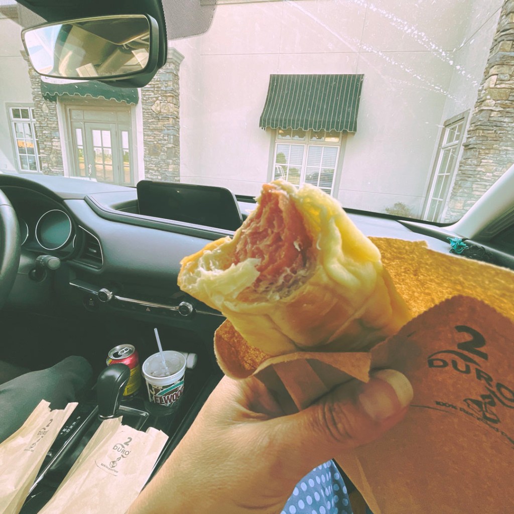 On repart, Manu a quand même mangé un donuts custard (la crème jaune à la vanille), et il était vriament heureux. Je n’ai toujours. pasréussi à en refaire en France. Comme on dit « C’est pas ça ». C’est pas. le même effet.