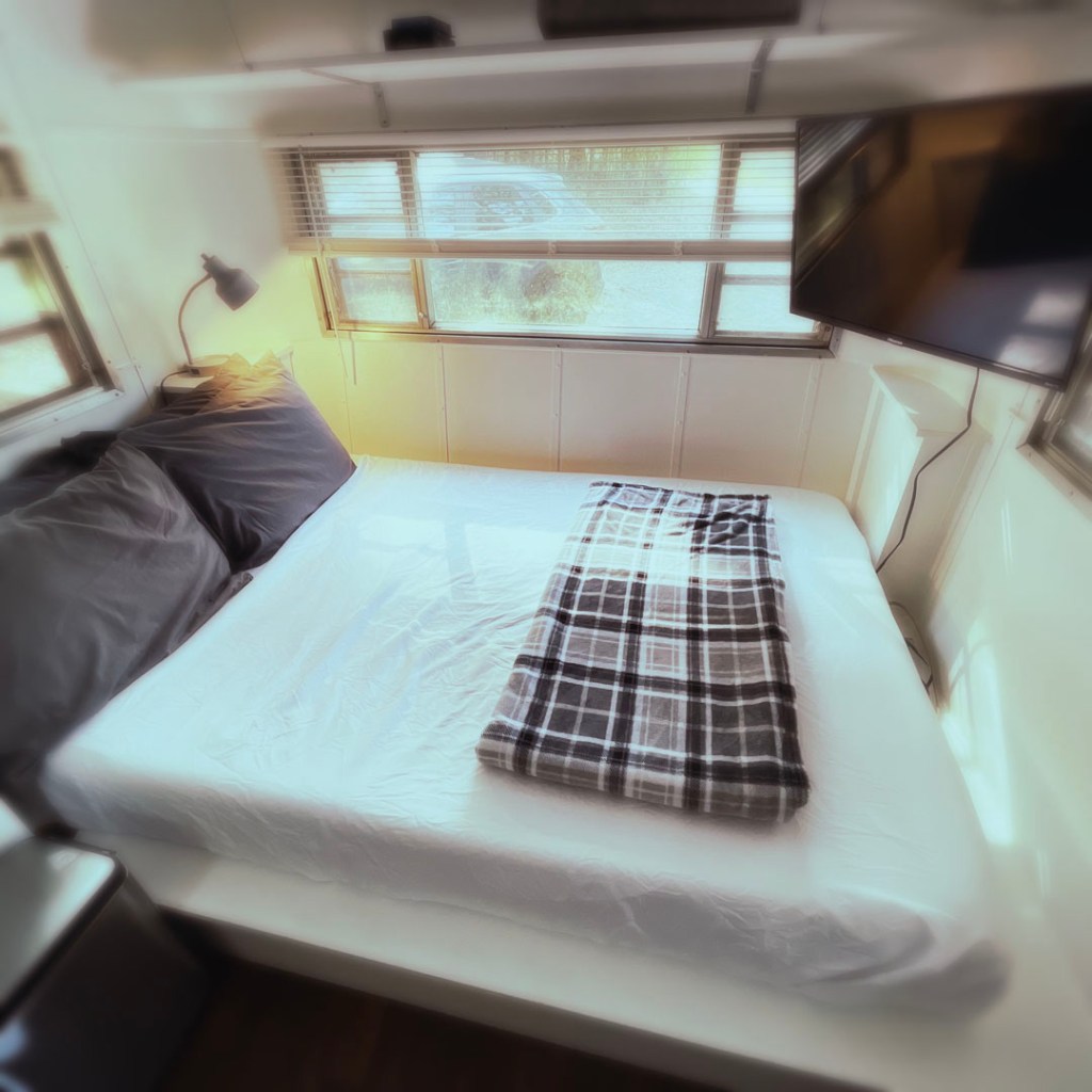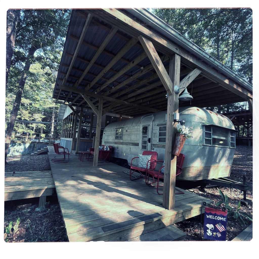 C’est une vieille caravane vintage, dans une forêt. Les proprios en ont retapé plusieurs sur leur terrain. Mais c’est bien foutu, on est isolé des autres, et en même temps, y’a pas d’autres invités. Héhéhé.