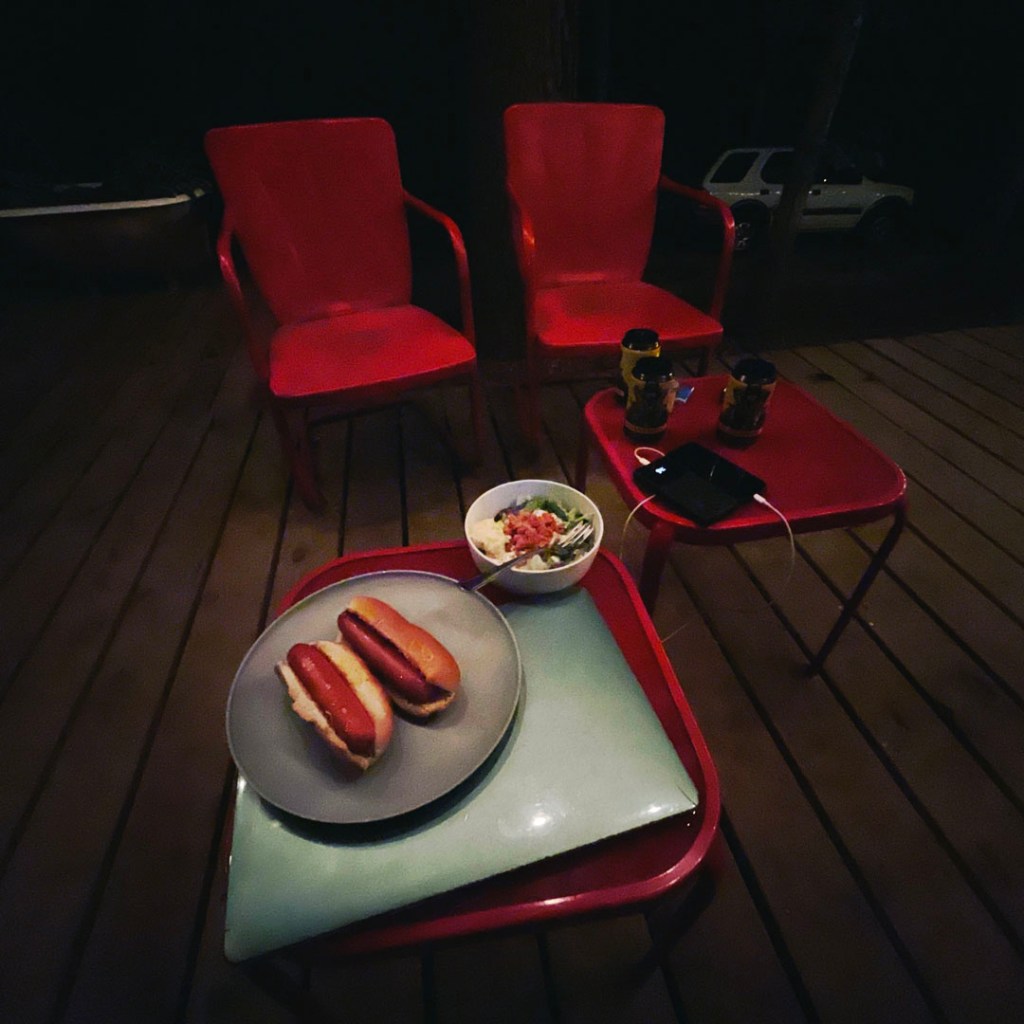 Hot dog, salade, super. On regarde le lendemain en profitant de la chaleur humide du dehors. On capitule, et on va se coucher à 21h1, en regaradant Walking Dead. Au milieu d’une forêt, dans une caravane. C’est tellement à-propos.