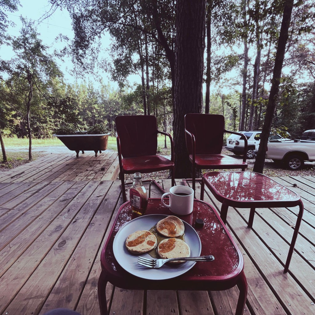 Ce matin, on profite de la caravane, et on traine jusqu’à 10h, le temps de ranger un peu, de prendre une douche et de manger des pancakes au micro onde. Aujourd’hui, on a moins de 200km à faire.