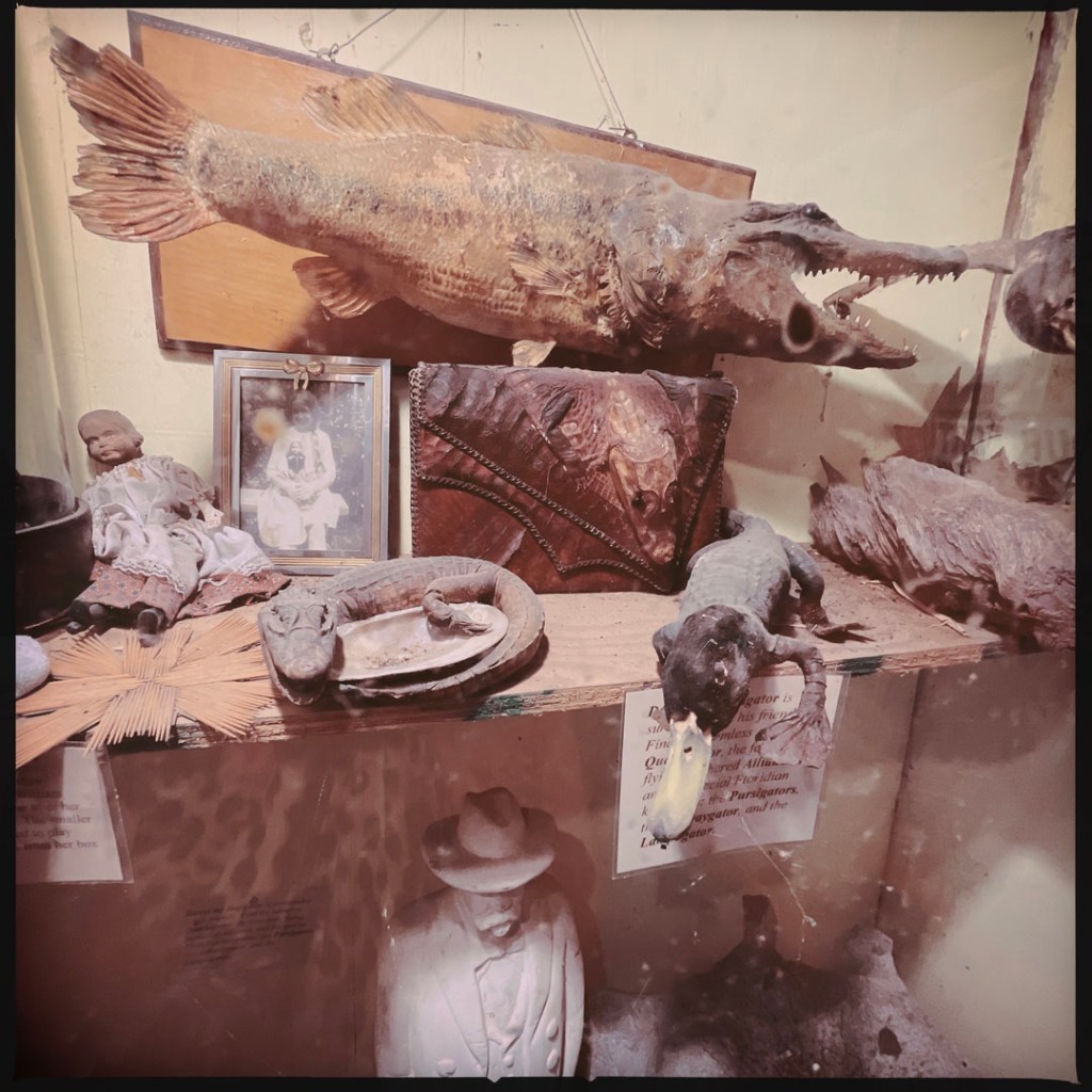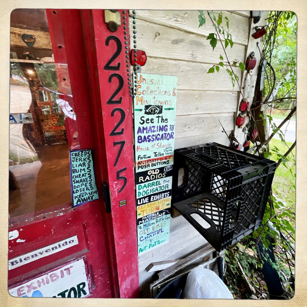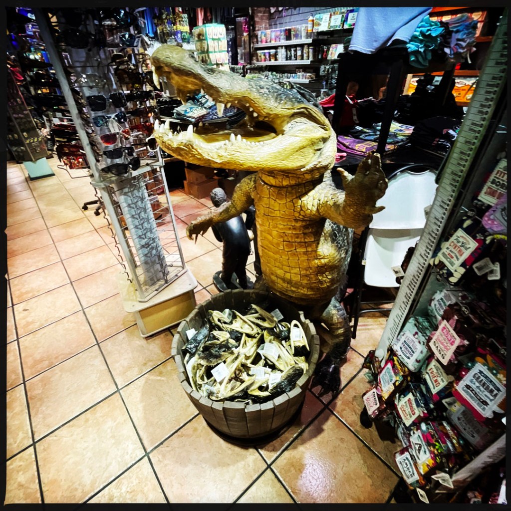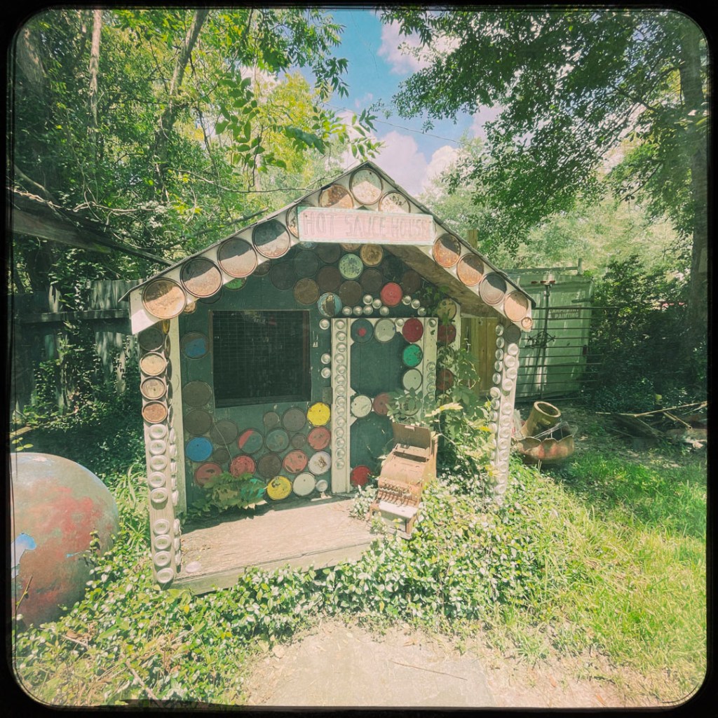 On retourne dehors, y’a une autre cabane (c’est grand en fait !), et puis un jardin avec une soucoupe volante, la maison des sauces piquantes, et le BASSIGATOR (un mélange de perche – le poisson – et d’alligator). En sortant, j’ai demandé au proprio qui l’avait pêché, il m’a dit « I did. If you want one, you have to go fishing. » Ce monsieur est vraiment drôle.