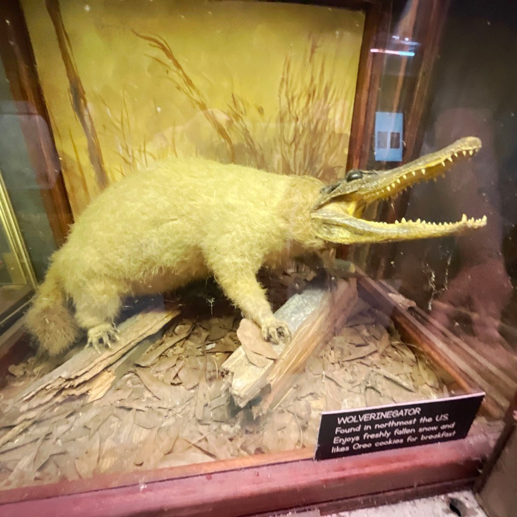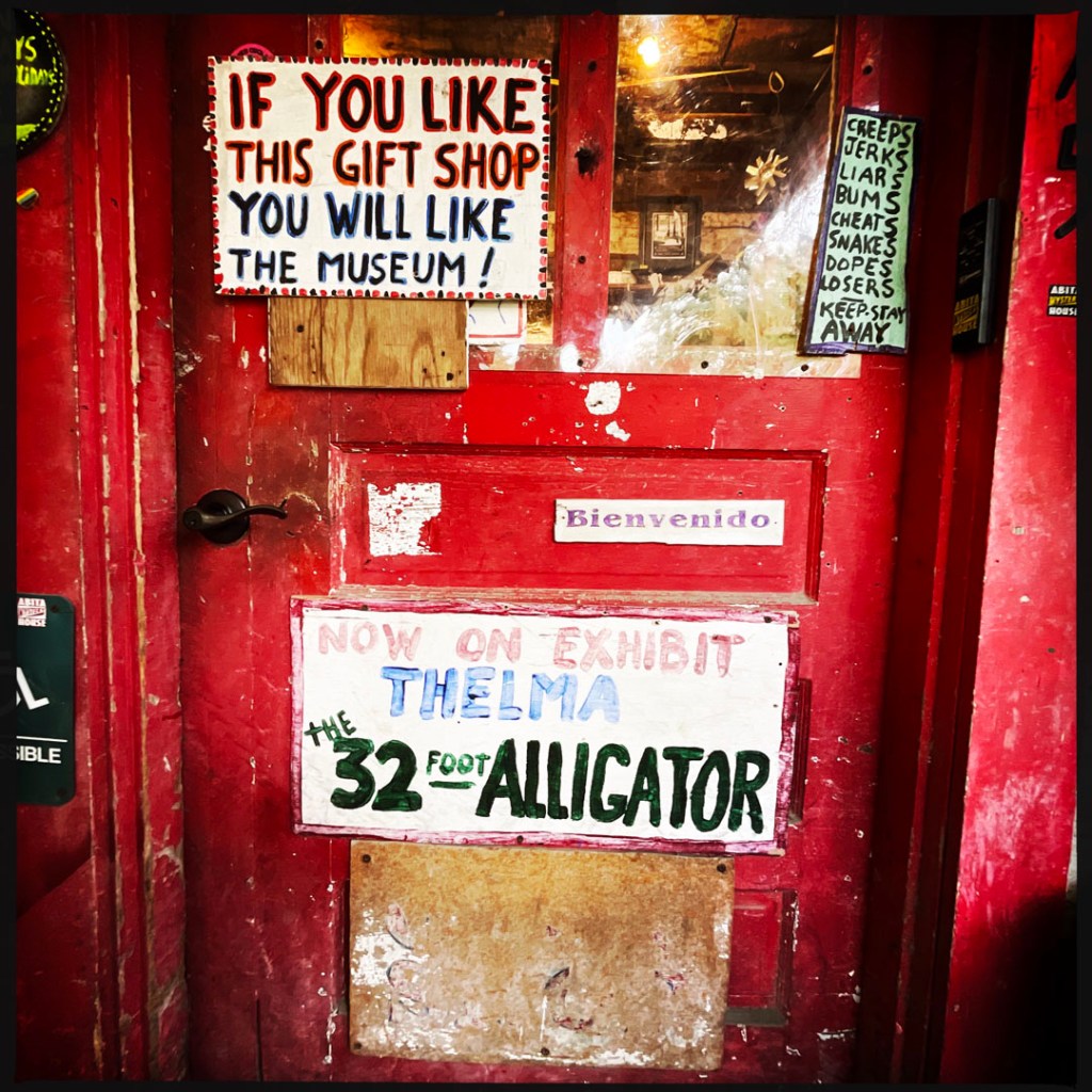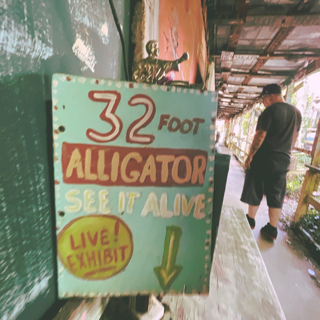 Il y a aussi le 32 foot alligator. La blague en français marche un peu moins. Mais dans la boite où ça annonce cet alligator, au lieu d’un alligator géant, c’est bien un alligator avec 32 pattes. Pardon mais je trouve ce monsieur vraiment vraiment drôle.