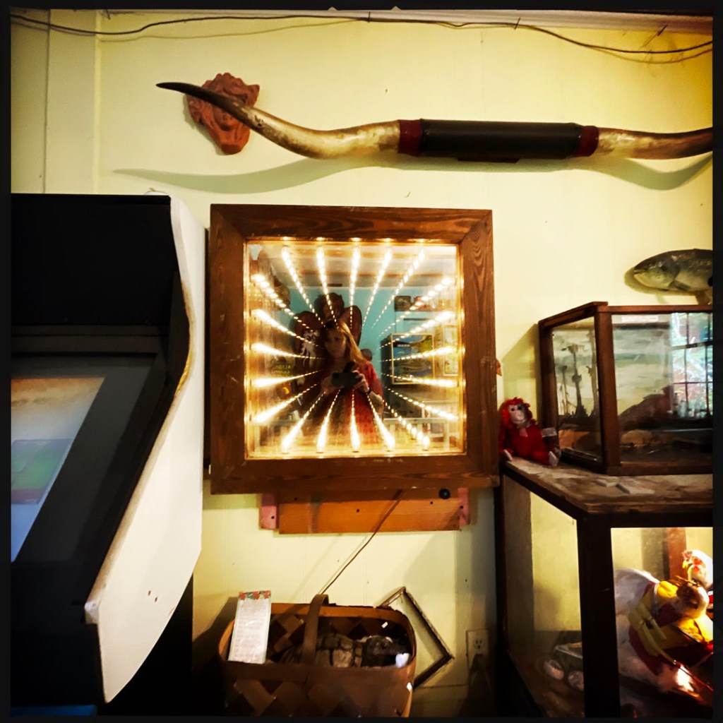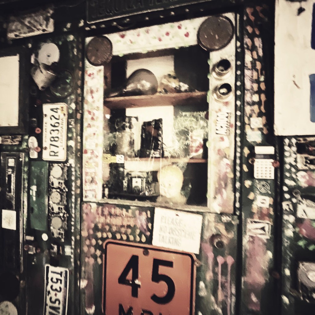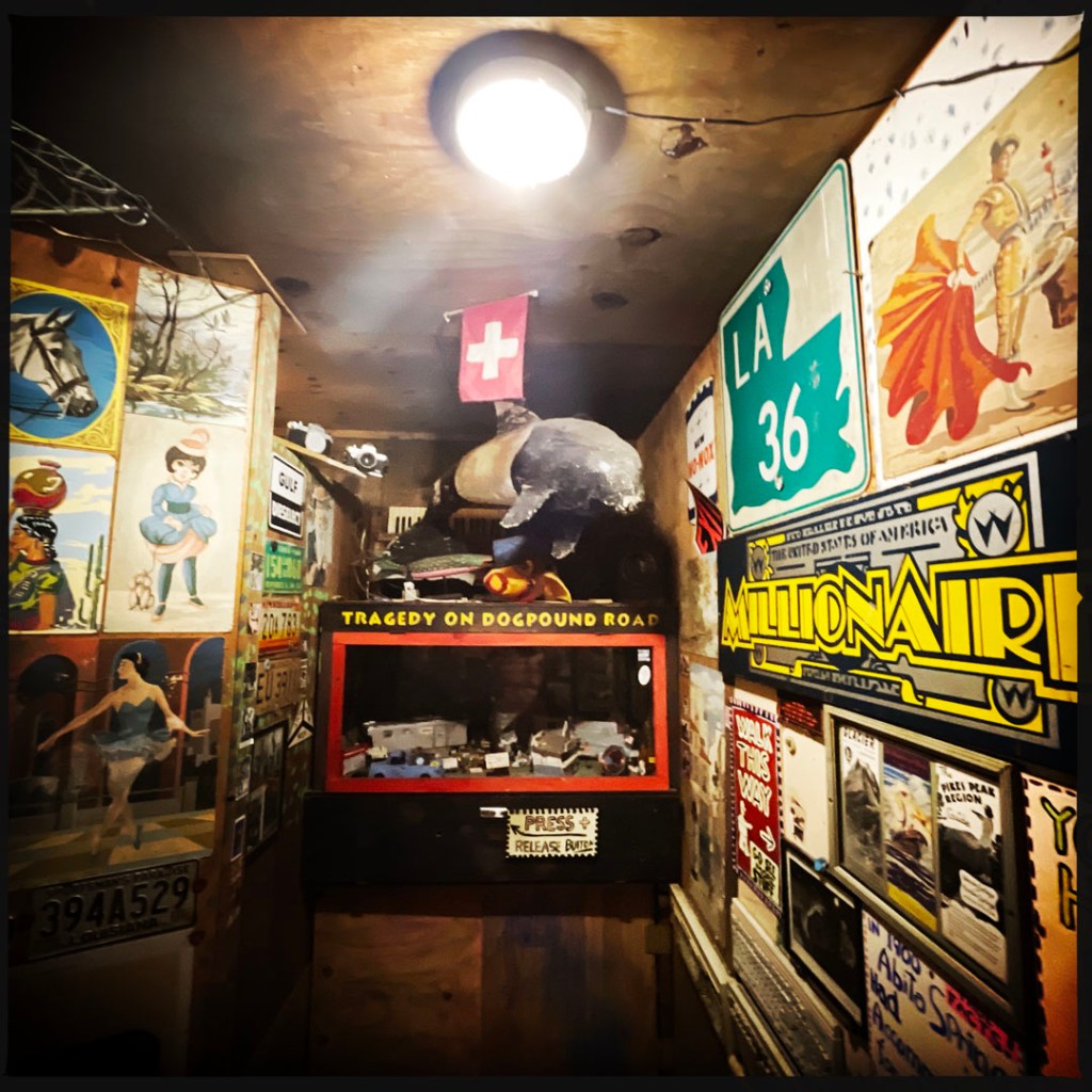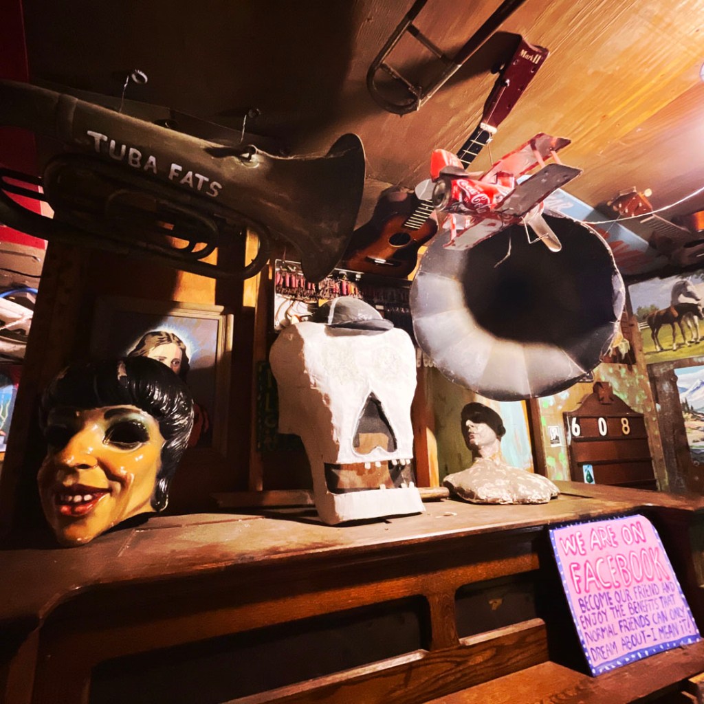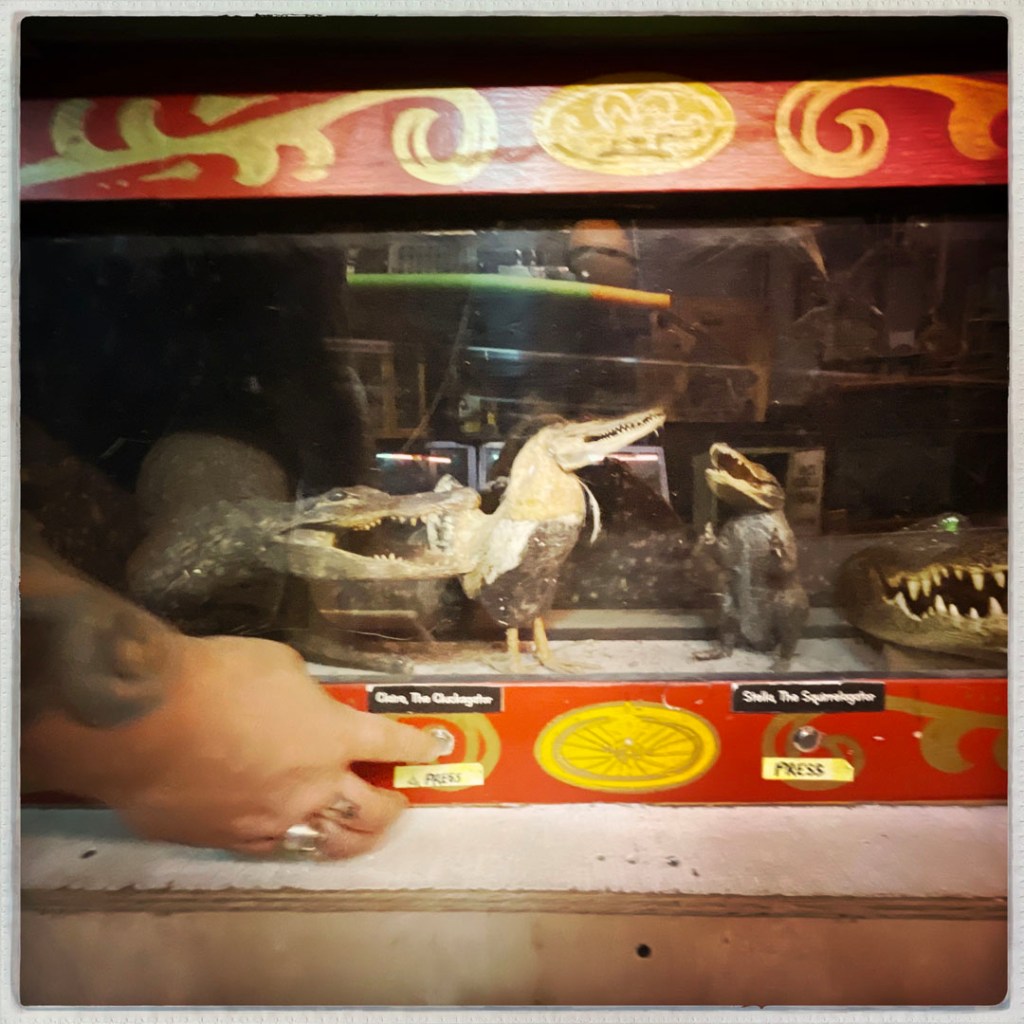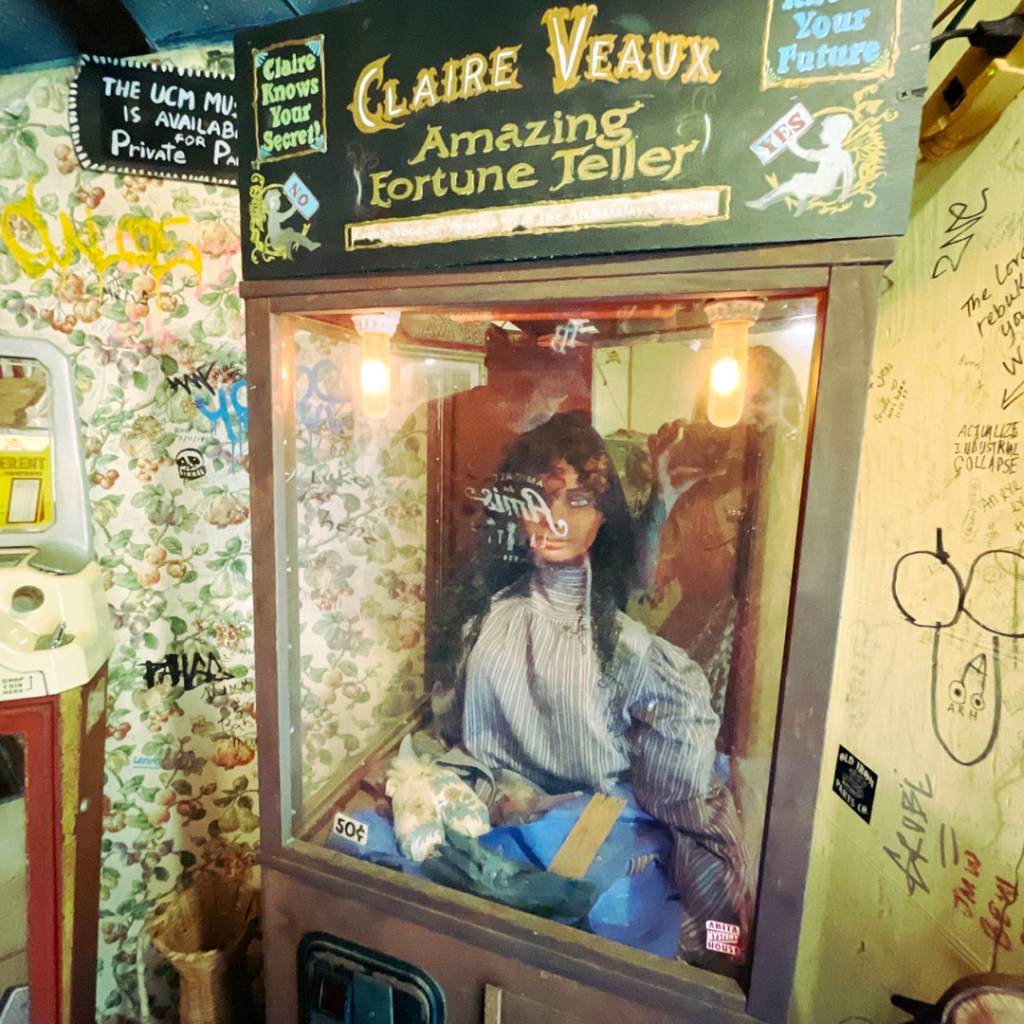 On ouvre la porte. La porte vers le bordel le plus merveilleux dans lequel je ne sois jamais rentrée. Ça va être difficile de tout décrire. Ça commence par un « palier » derrière la grosse cabane en bois, et y’a une autre cabane en bois. Et là, c’est formidable. TOUT. On ne sait plus où donner de la tête, car, de fait, y’a objets, des affiches, des automates, des taxidermies folles. On mets des quarters dans des machines qui font bouger des trucs, qui prédisent ce qu’on va manger (j’ai eu des tiques et des crevettes).