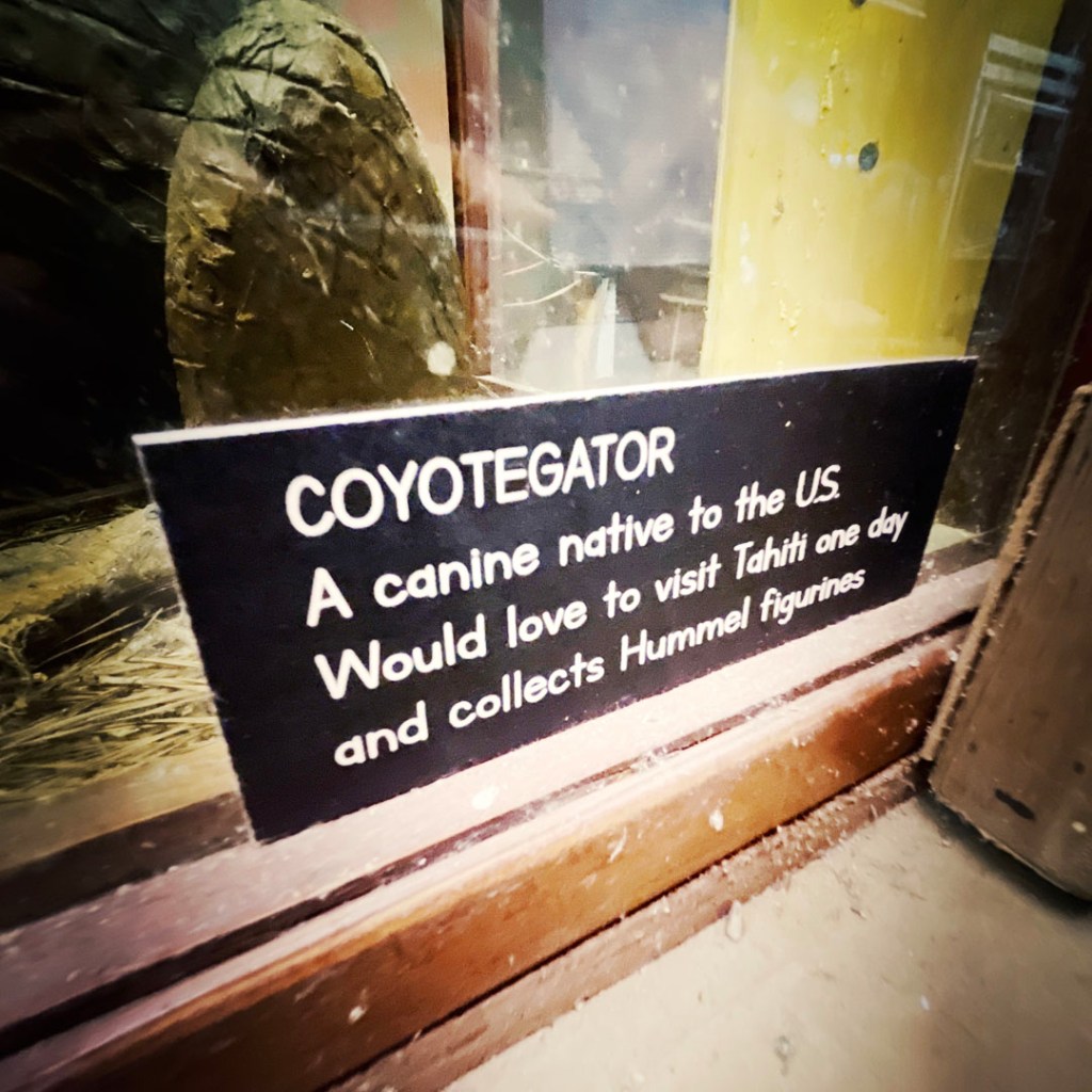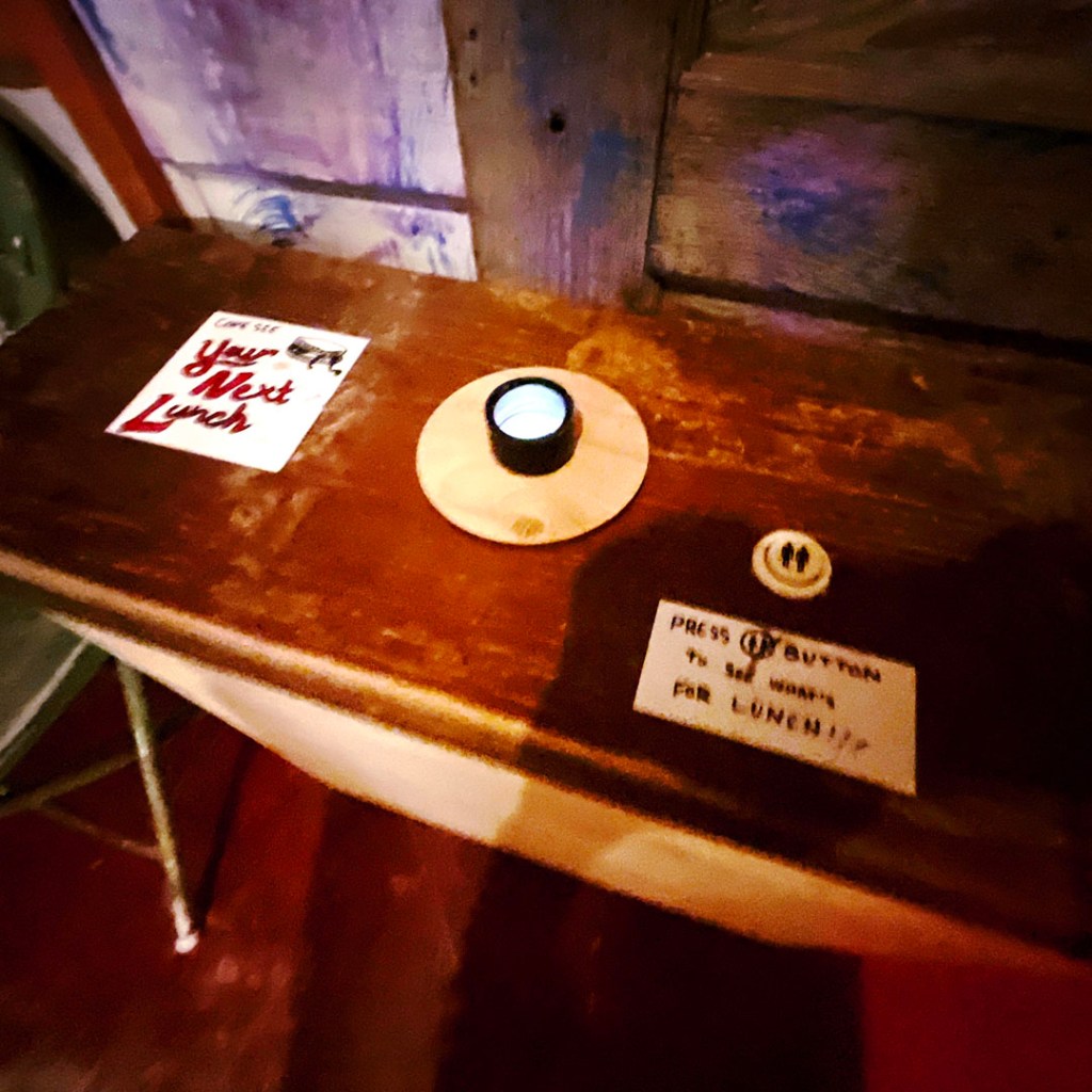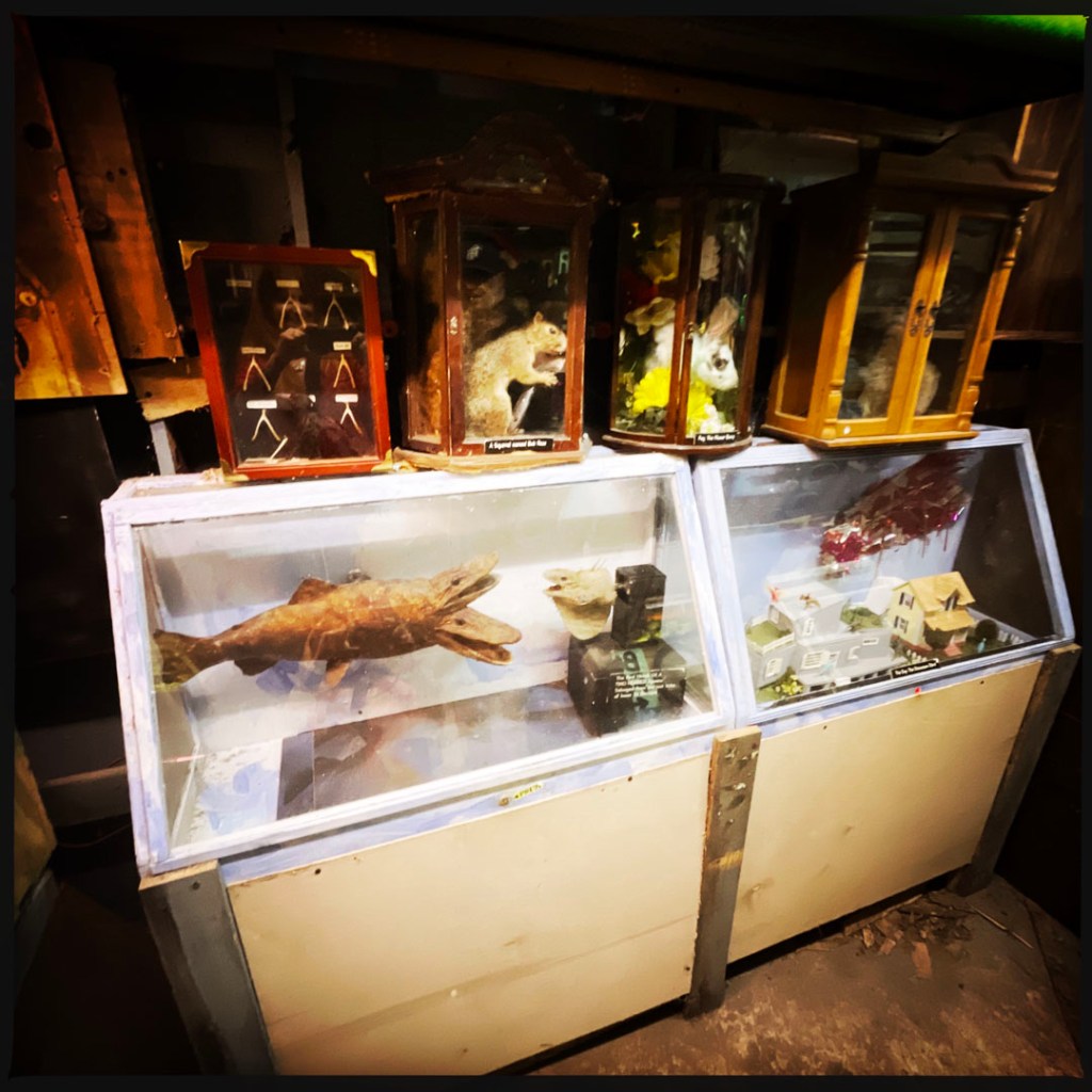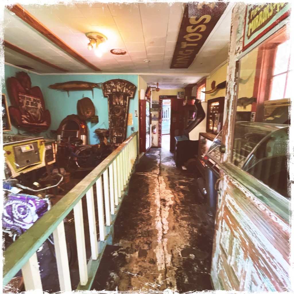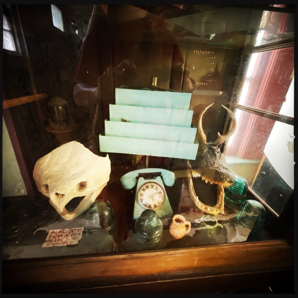 On ouvre la porte. La porte vers le bordel le plus merveilleux dans lequel je ne sois jamais rentrée. Ça va être difficile de tout décrire. Ça commence par un « palier » derrière la grosse cabane en bois, et y’a une autre cabane en bois. Et là, c’est formidable. TOUT. On ne sait plus où donner de la tête, car, de fait, y’a objets, des affiches, des automates, des taxidermies folles. On mets des quarters dans des machines qui font bouger des trucs, qui prédisent ce qu’on va manger (j’ai eu des tiques et des crevettes).