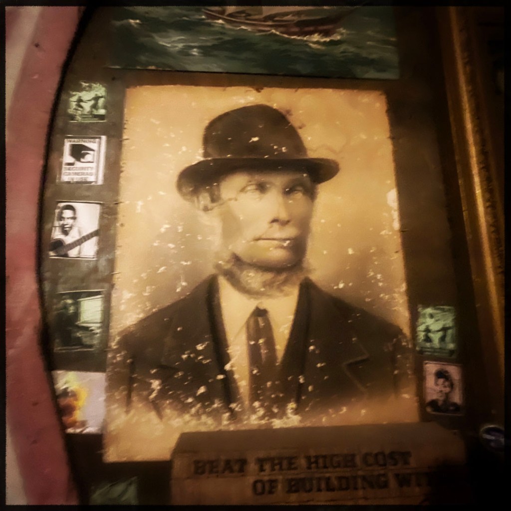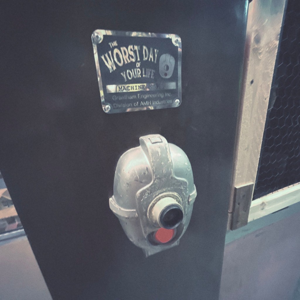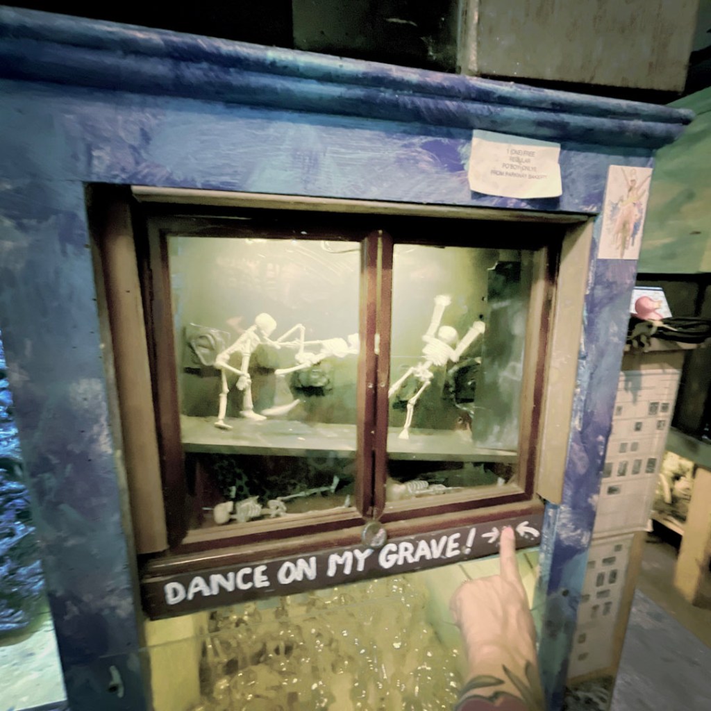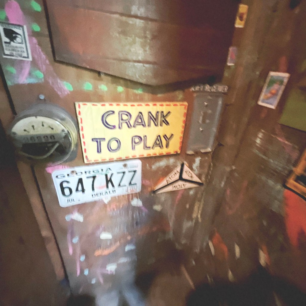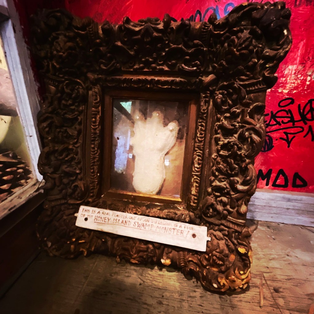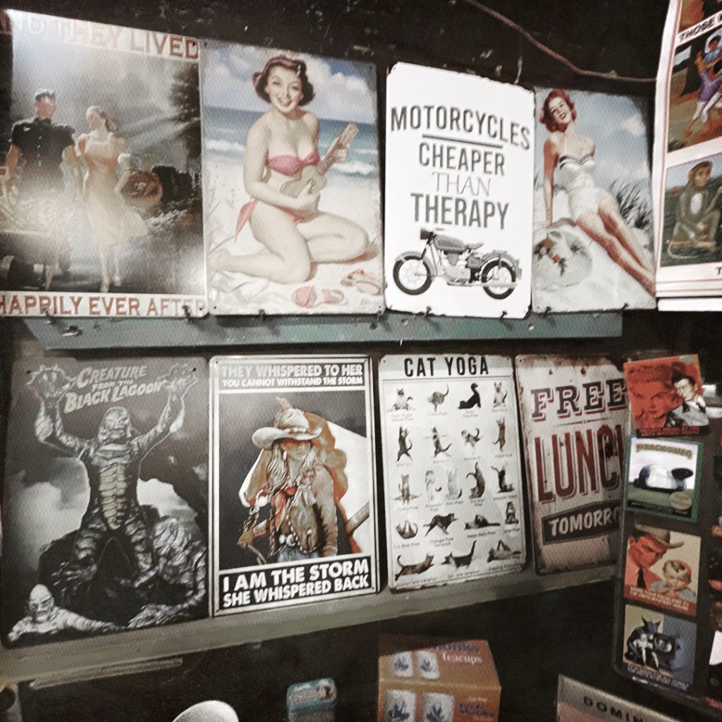 On ouvre la porte. La porte vers le bordel le plus merveilleux dans lequel je ne sois jamais rentrée. Ça va être difficile de tout décrire. Ça commence par un « palier » derrière la grosse cabane en bois, et y’a une autre cabane en bois. Et là, c’est formidable. TOUT. On ne sait plus où donner de la tête, car, de fait, y’a objets, des affiches, des automates, des taxidermies folles. On mets des quarters dans des machines qui font bouger des trucs, qui prédisent ce qu’on va manger (j’ai eu des tiques et des crevettes).