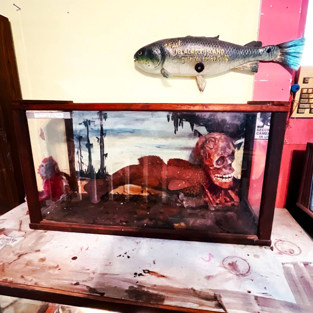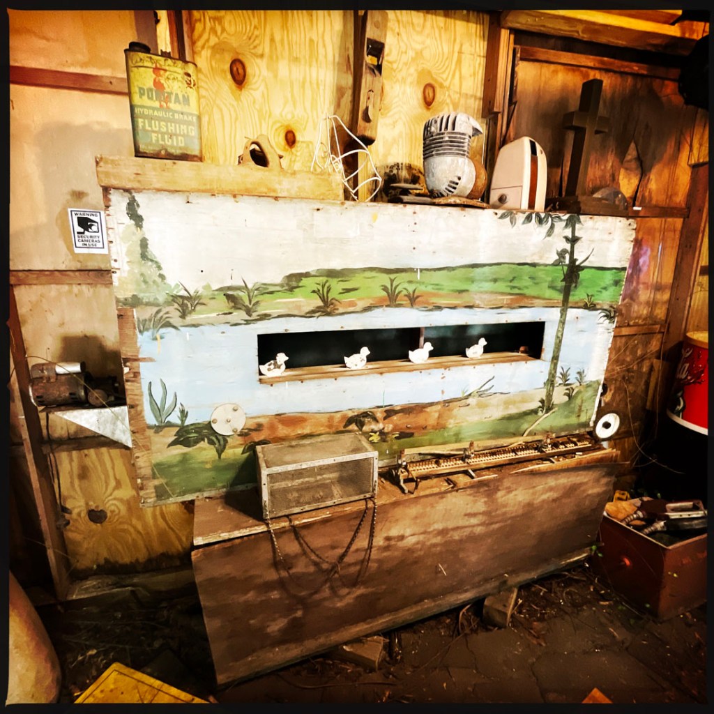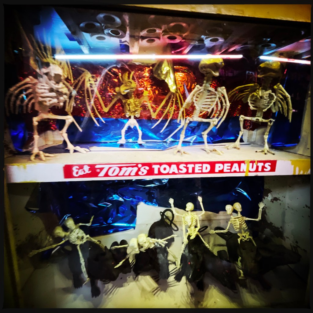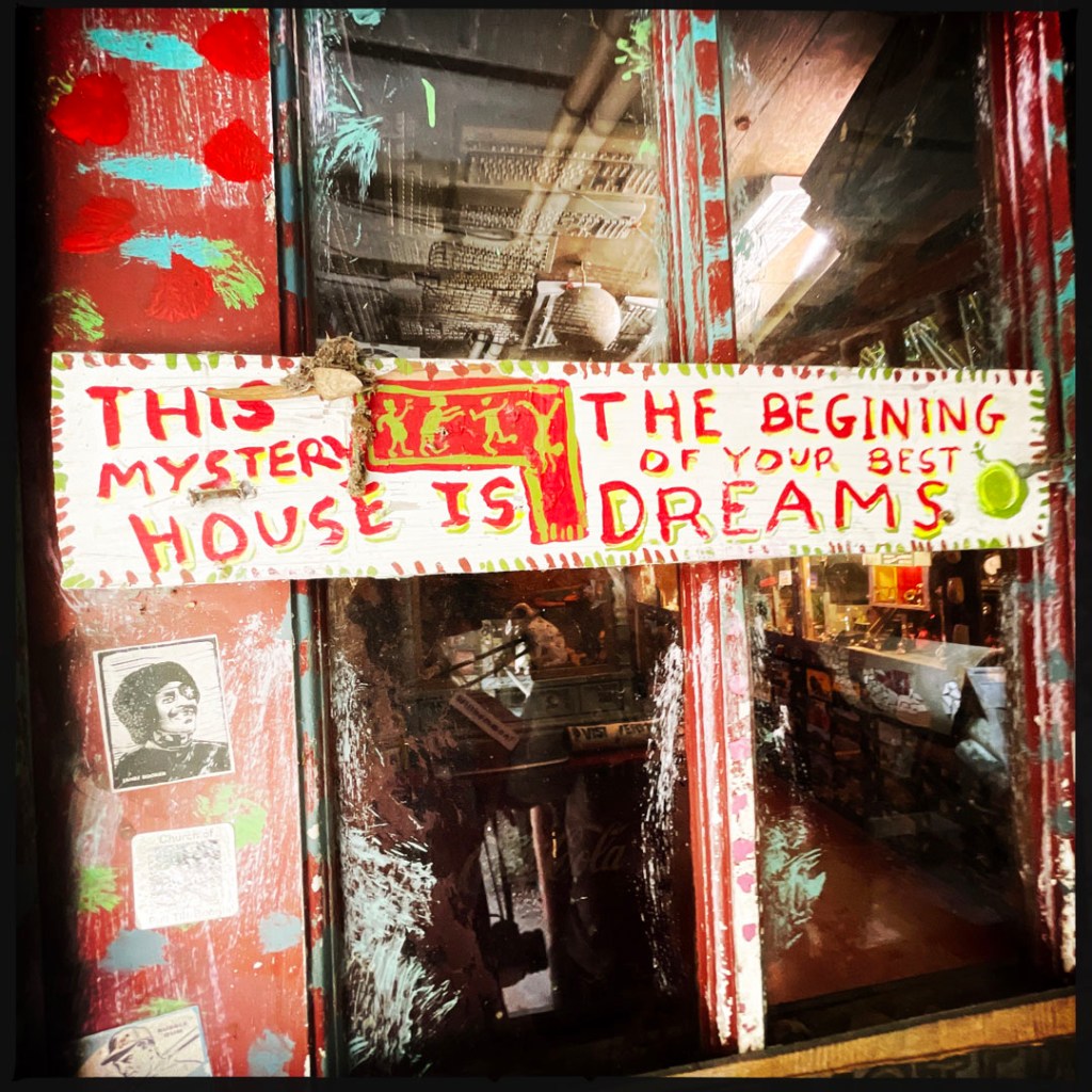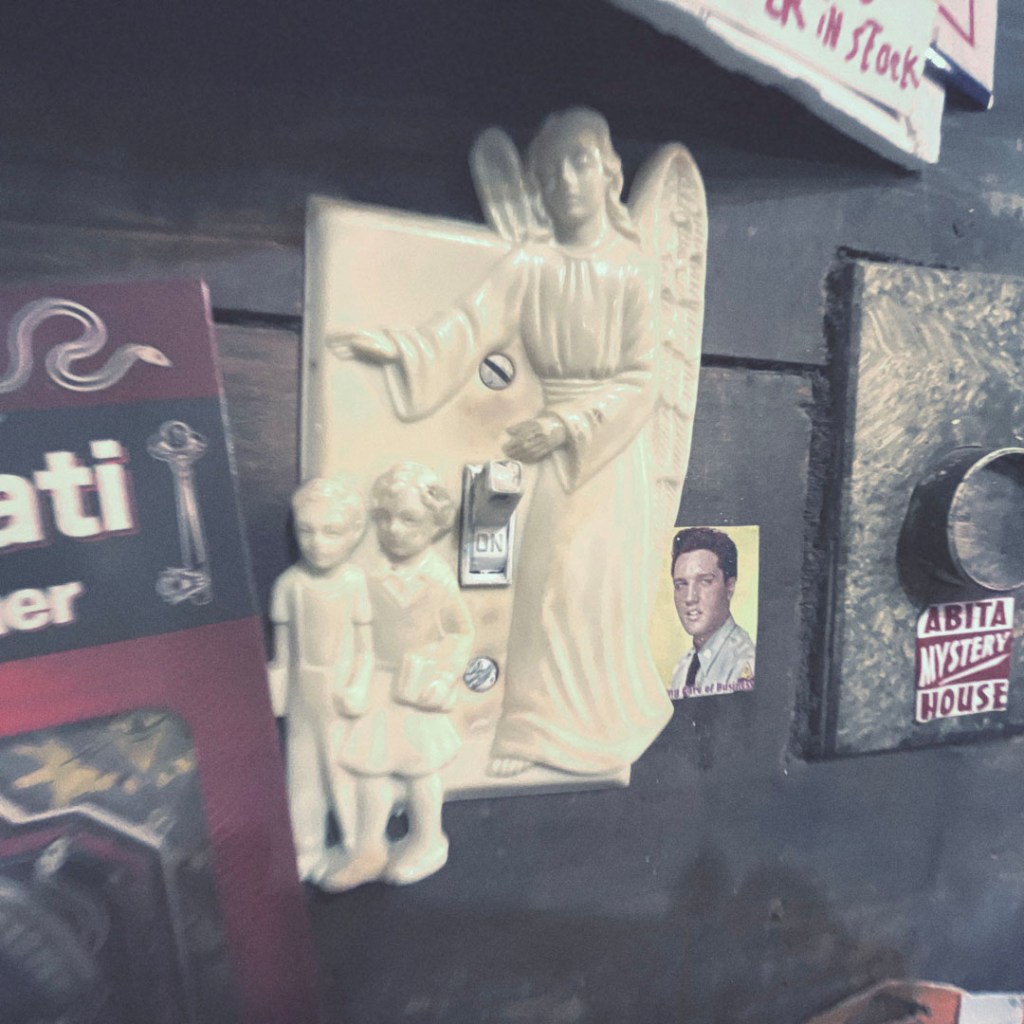 On ouvre la porte. La porte vers le bordel le plus merveilleux dans lequel je ne sois jamais rentrée. Ça va être difficile de tout décrire. Ça commence par un « palier » derrière la grosse cabane en bois, et y’a une autre cabane en bois. Et là, c’est formidable. TOUT. On ne sait plus où donner de la tête, car, de fait, y’a objets, des affiches, des automates, des taxidermies folles. On mets des quarters dans des machines qui font bouger des trucs, qui prédisent ce qu’on va manger (j’ai eu des tiques et des crevettes).
