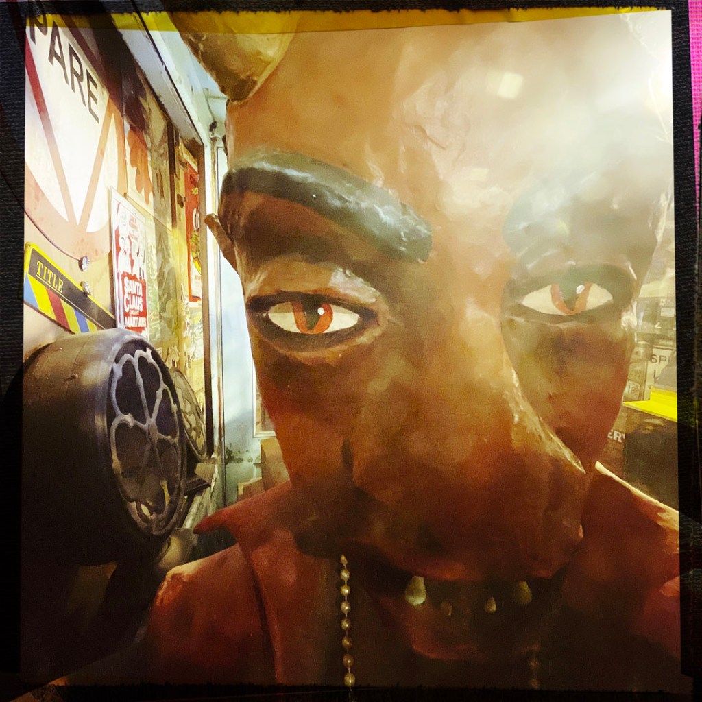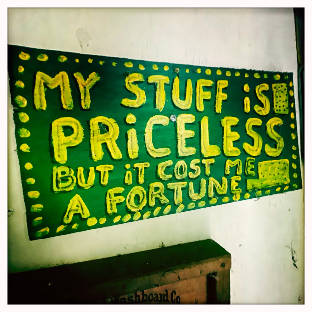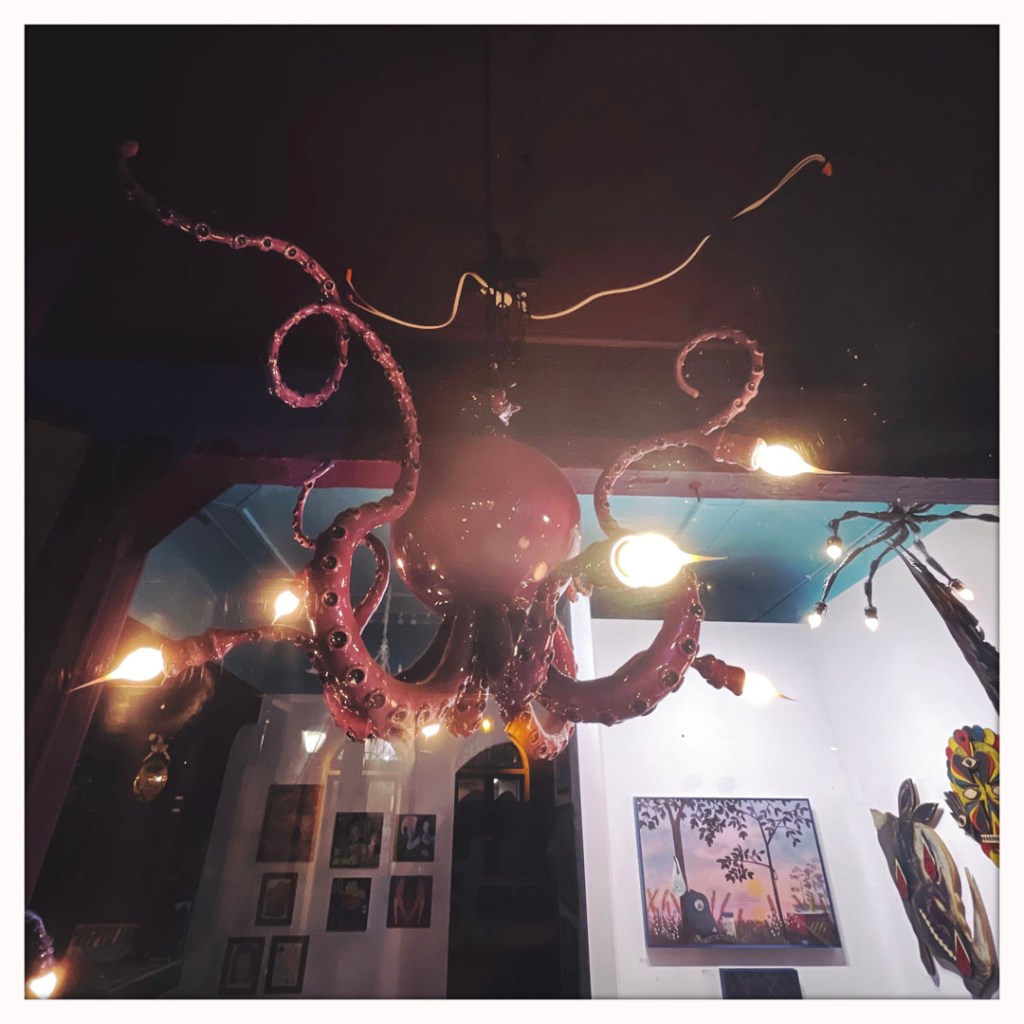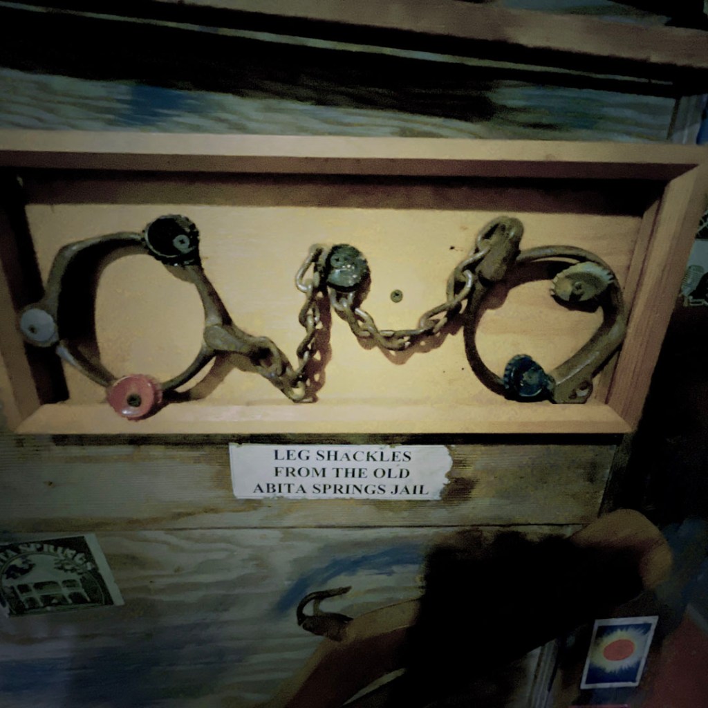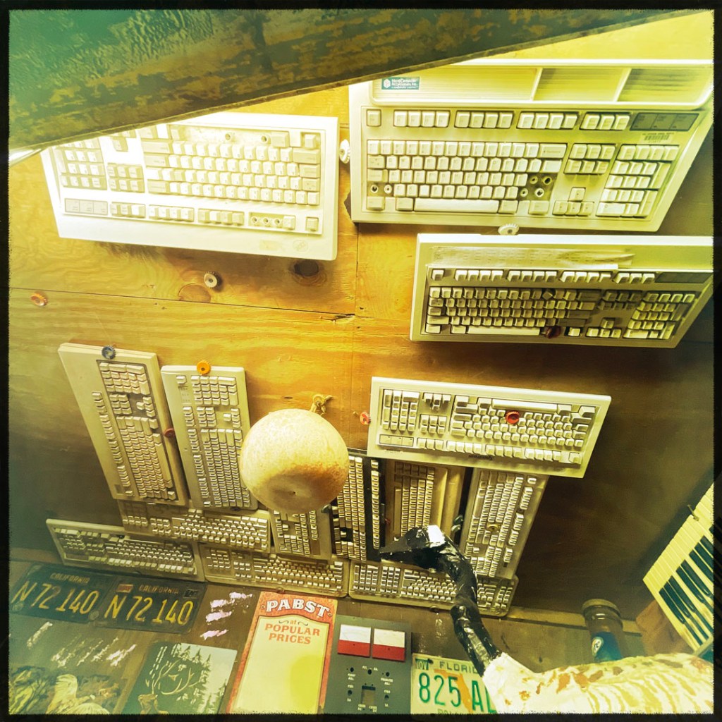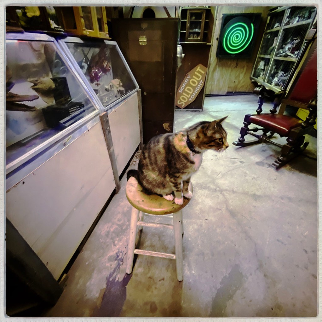 On ouvre la porte. La porte vers le bordel le plus merveilleux dans lequel je ne sois jamais rentrée. Ça va être difficile de tout décrire. Ça commence par un « palier » derrière la grosse cabane en bois, et y’a une autre cabane en bois. Et là, c’est formidable. TOUT. On ne sait plus où donner de la tête, car, de fait, y’a objets, des affiches, des automates, des taxidermies folles. On mets des quarters dans des machines qui font bouger des trucs, qui prédisent ce qu’on va manger (j’ai eu des tiques et des crevettes).