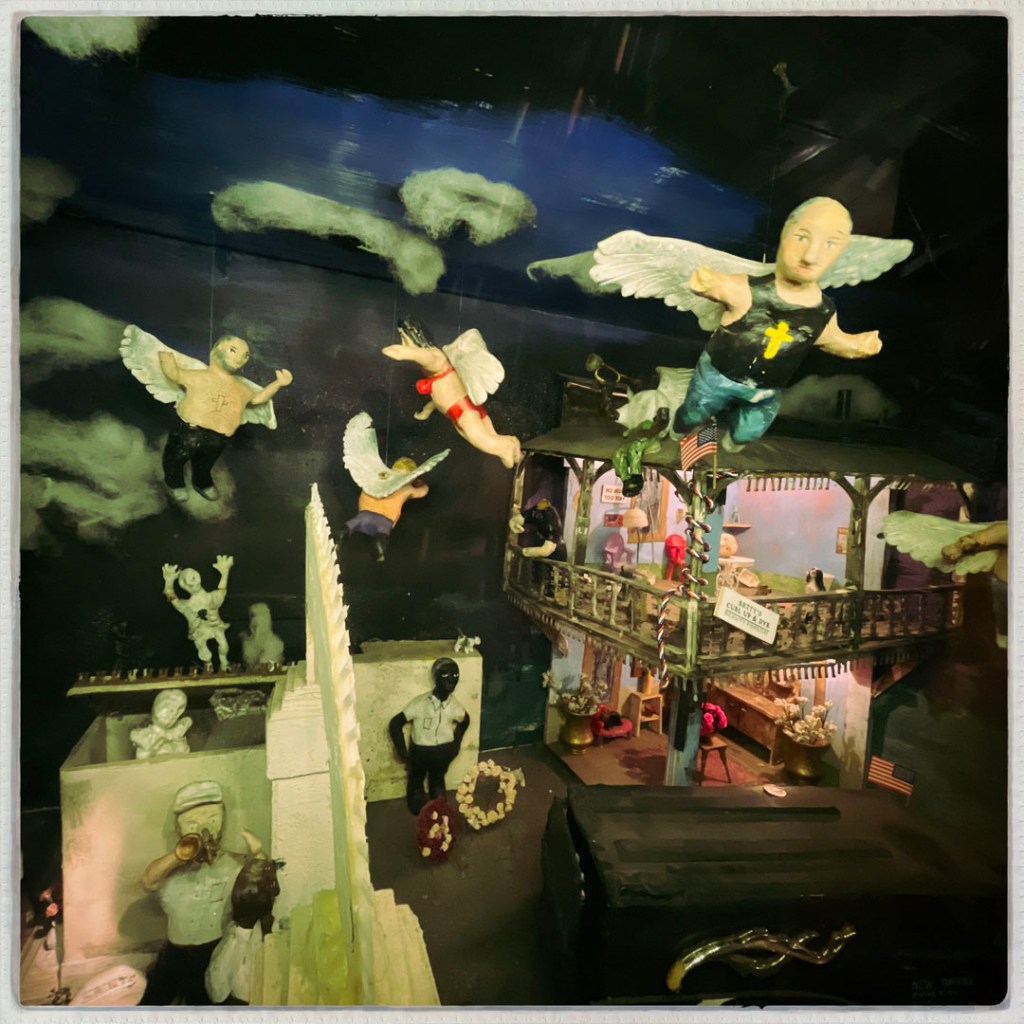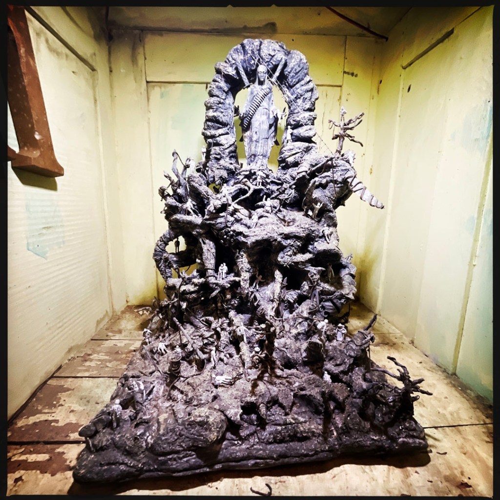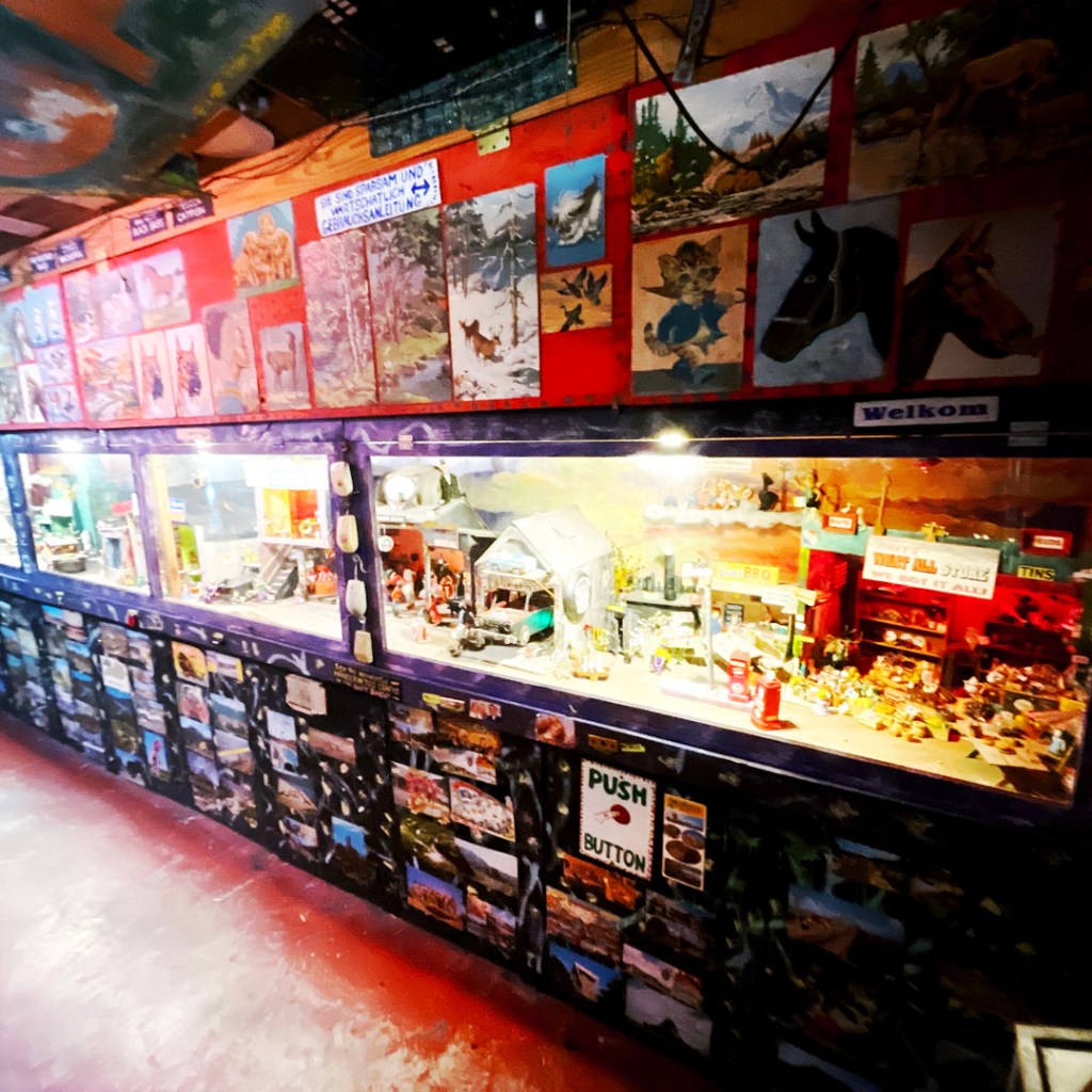 Il y a aussi plein de dioramas, et quand on appuie sur des boutons, ça fait bouger des trucs. Il y a des tas d’objets animés, un piano à manivelle, des pancartes, des panneaux. Je vous laisse jeter un oeil à ce joyeux foutoir sur les photos de la fin (y’a d’autres vidéos aussi).