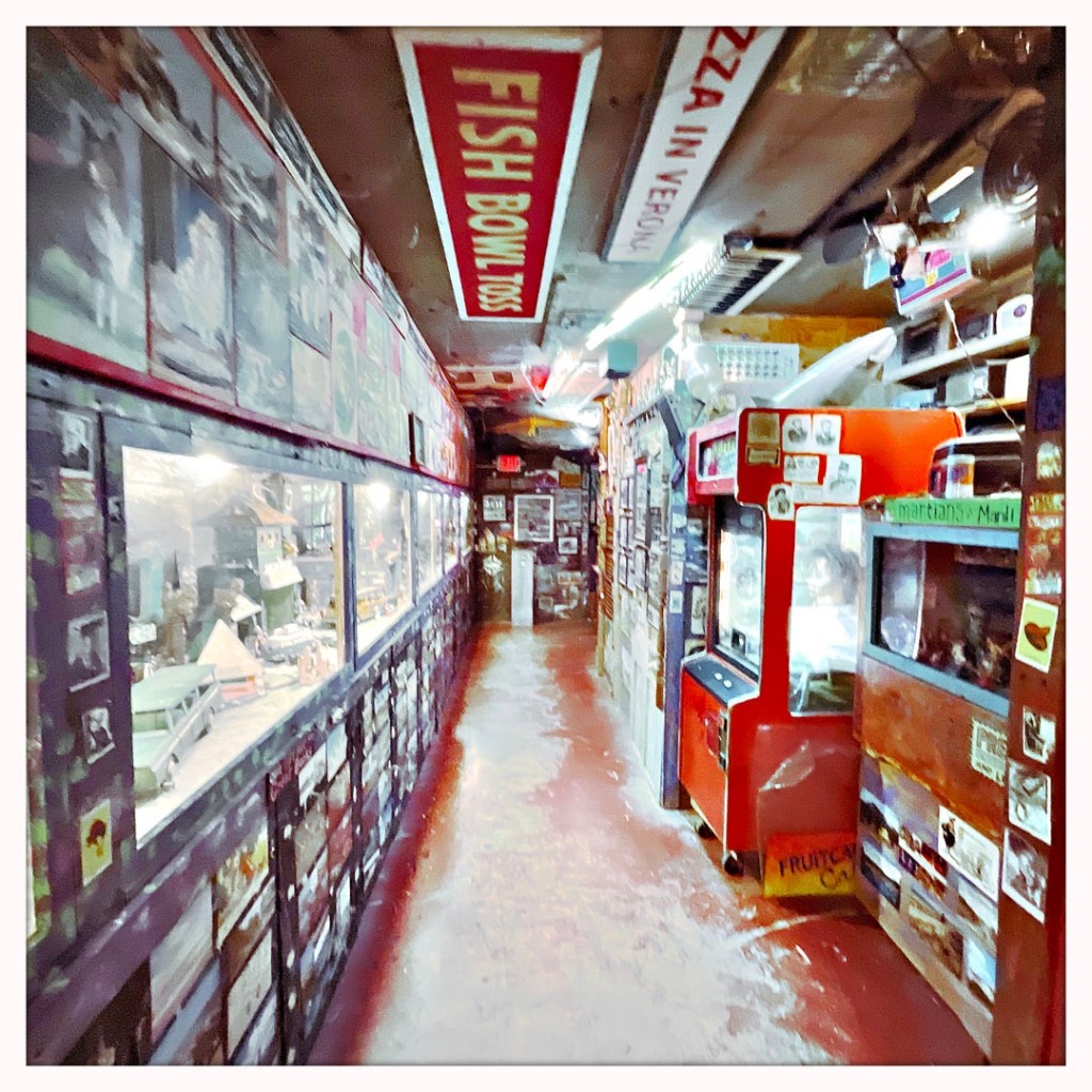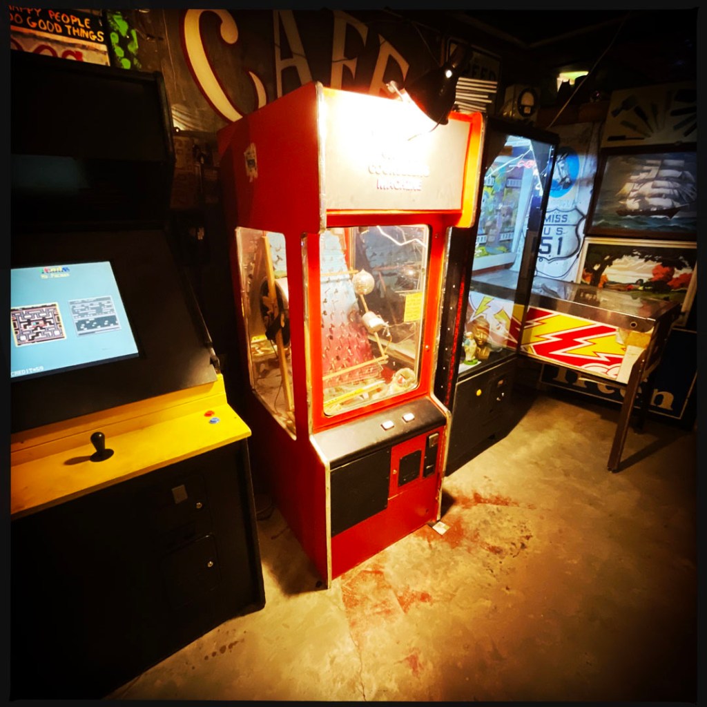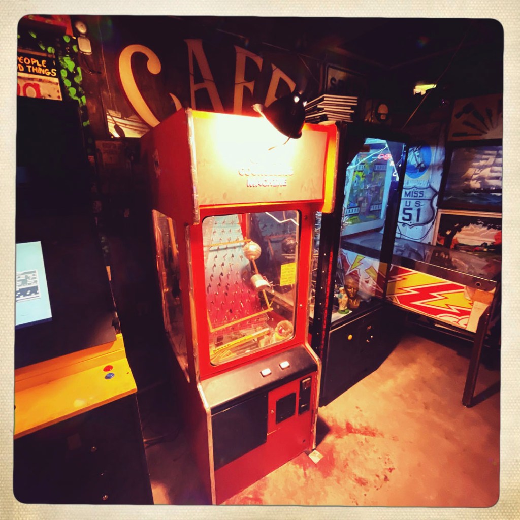 Il a une pilosité de visage blanche, des joues sympa et il annonce : « It’s free to go in, you’ll pay to get out. » J’ai ri. Ensuite, il nous dit de prendre des quarters (des pièces de 25 cents) qui sont dans un panier en osier devant lui. « For the machines, and the pinballs… you’ll see. » Je prends 5 quarters.