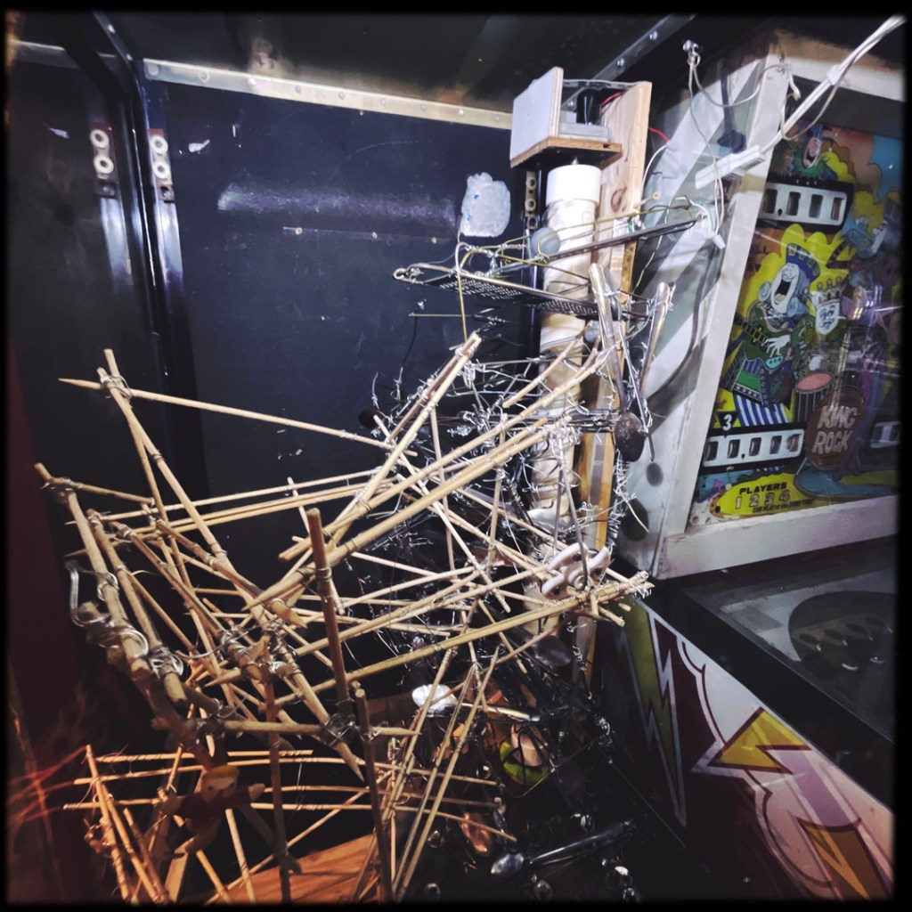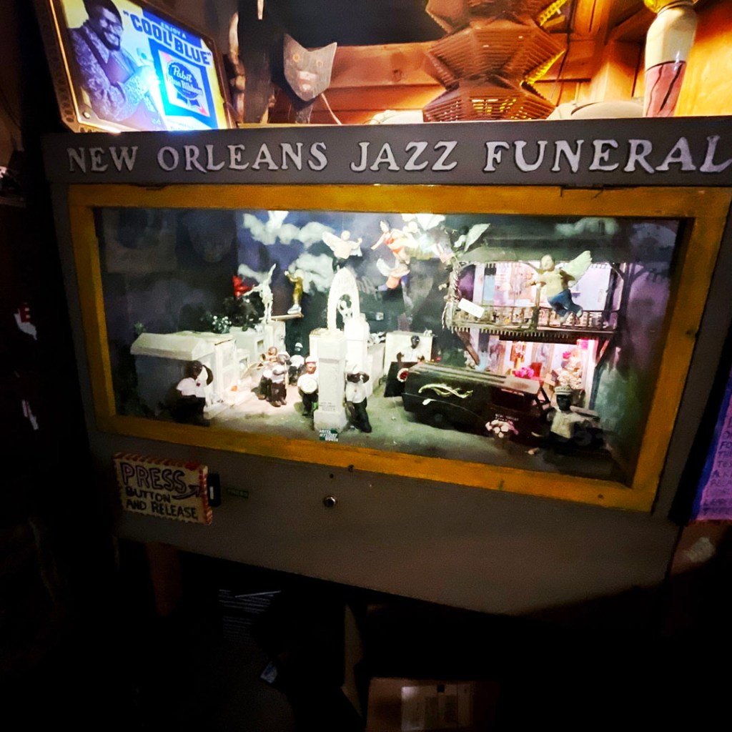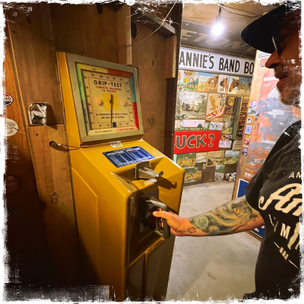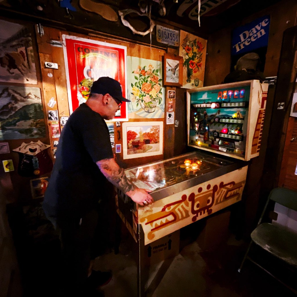 Il a une pilosité de visage blanche, des joues sympa et il annonce : « It’s free to go in, you’ll pay to get out. » J’ai ri. Ensuite, il nous dit de prendre des quarters (des pièces de 25 cents) qui sont dans un panier en osier devant lui. « For the machines, and the pinballs… you’ll see. » Je prends 5 quarters.