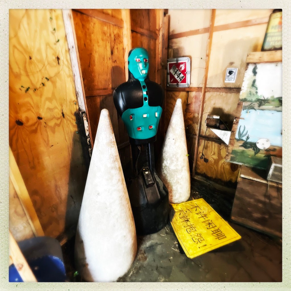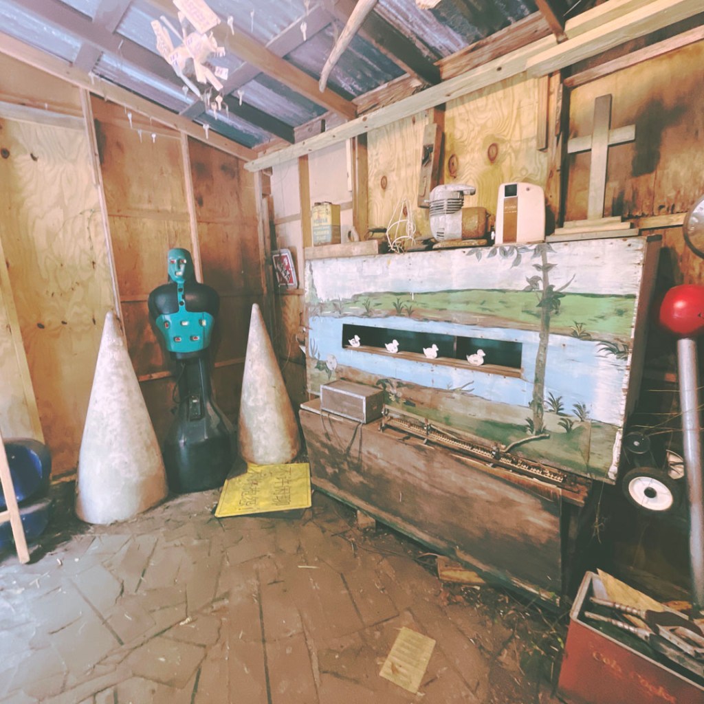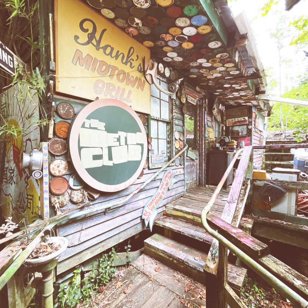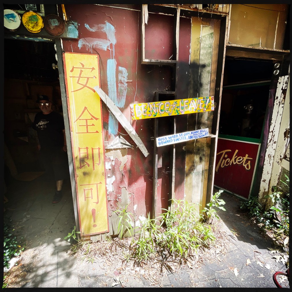 À la seconde où on arrive, j’aime déjà cet endroit. Une grosse cabane en bois. Y’a du bordel dehors, un super capharnaüm. Y’a des tas de panneaux qui invite à rentrer, à visiter, à prendre des photos, à tout.