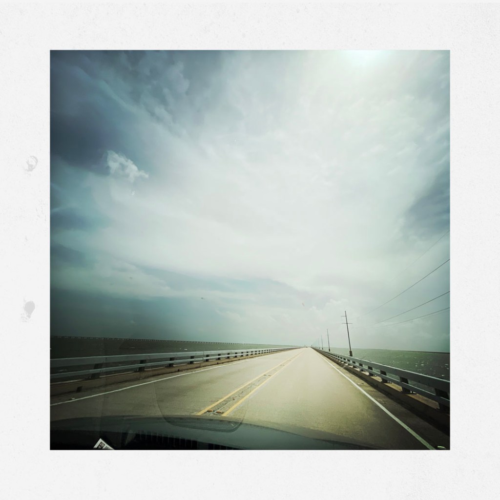 Arrive le grand pont qui amène à NOLA (c’est l’abréviation pour New Orleans. Si je ne sais pas trop comment ça se place à l’oral, à l’écrit, c’est pratique.) C’est un super long pont. Autour, y’a des pélicans qui volètent. C’est chouette.