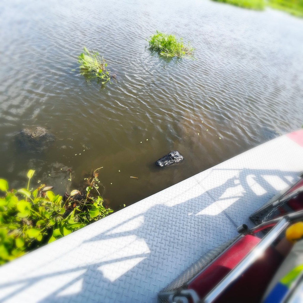 En plus, bon sang, y’-t-il vraiment besoin de ce spectacle, du gator qui sautille hors de l’eau pour un bonbec ? Il y en a partout des alligators ! On les voit passer dans l’eau, à la cool. Leurs petites narines et leurs grands yeux mignons qui dépassant. Des tas d’oiseaux s’envolent sur notre passage, la végétation est dingue.