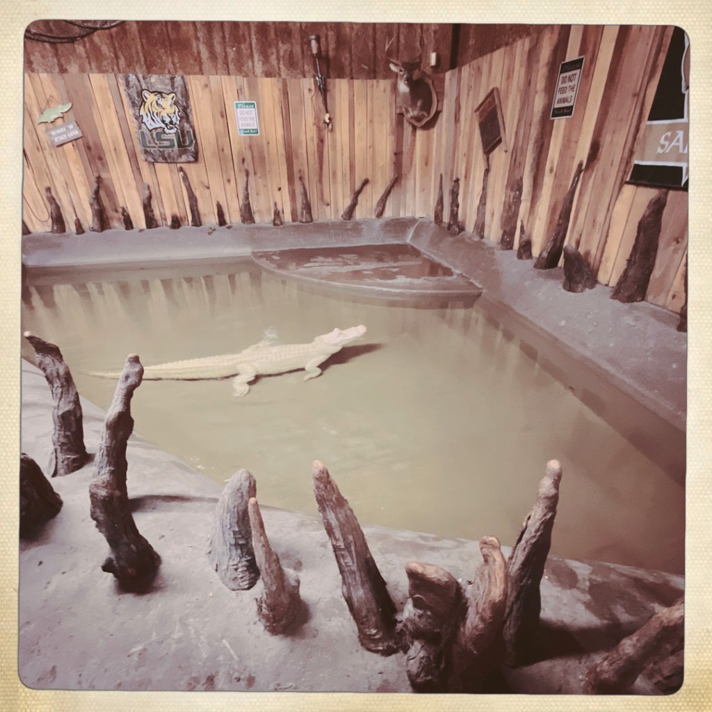 On passe au gift shop surtout pour faire pipi, et horreur malheur, ils ont un bac dans le fond, avec un alligator tout seul dedans, qui est albinos. Il est beau, il regarde fixement un panneau au dessus où est écrit « Do not feed ». Je pense que ça doit l’agacer, ce panneau.