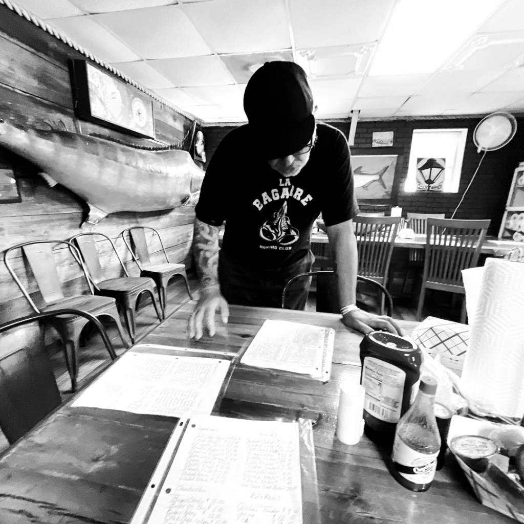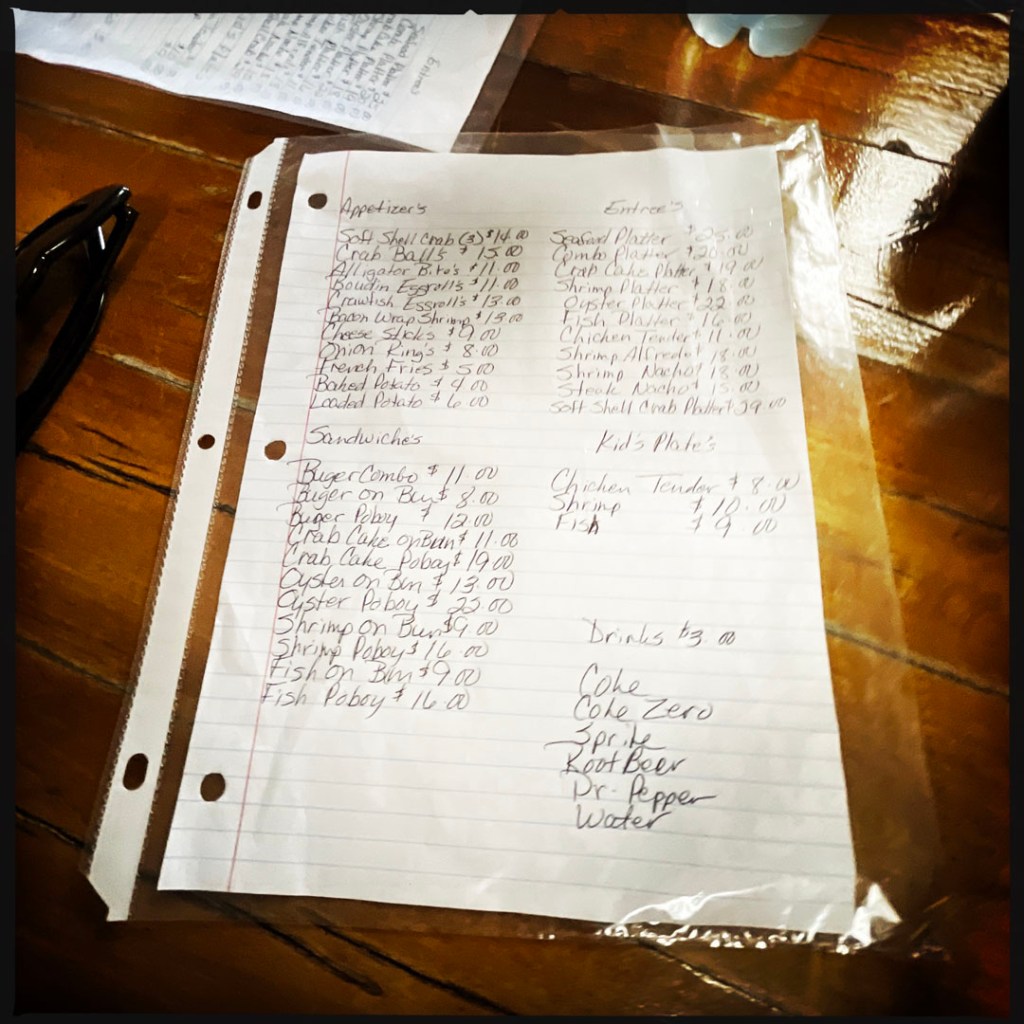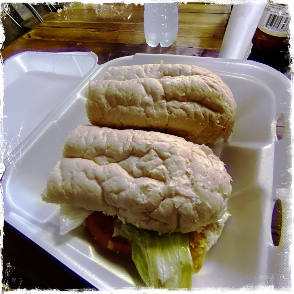 On se met en route et on se dit qu’on est loin des touristes dans cette petites ville du pirate Jean Lafitte. Je trouve sur l’internet, un truc un peu local. C’est presque au bout de la ville (après, y’a de l’eau). Une maison un peu en hauteur On entre. Y’a un couloir, y’a personne. Ah. si! Une petite dame sympa. On est les seul clients. On commande l’incontournable Po’boy (oui, c’est le nom d’un de nos chats). C’est le sandwich typique du coin. Une baguette (d’ici) qui dont ferait tomber dans les pommes les boulangers français. Une viande, et des conneries. On prend crevettes !