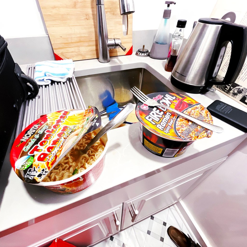 On rentre, finalement point de gumbo il y aura. J’ai faim. Manu aussi. Alors en rentrant, on profite de nos super courses de l’après-midi : des ramens en plastique dans un bol en carton.