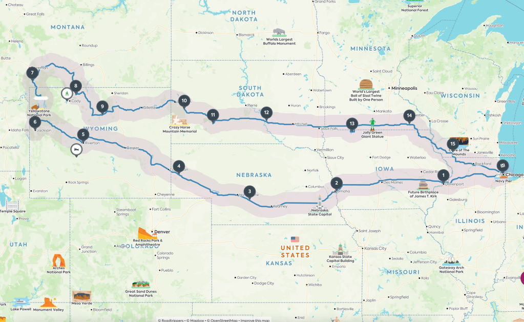 On en a choisi un, mais lointain : Le Parc National de Yellowstone. De Chicago, ça fait un peu plus de 2000km. Nous devrions croiser sur la route environ 5 personnes.