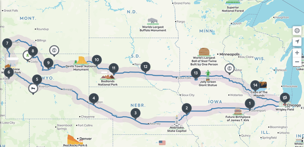 En gros, je trouve l’aéroport. Le prix du billet joue beaucoup. Mais là, on va chez ma tante à Chicago. Et puis après, on décide d’un trajet, de où on veut aller. Et j’utilise une appli de raodtrip, pour jalloner la route d’étapes. Et après, je cherche des endroits où dormir, et j’ajuste le trajet. Je réserve à l’avance, toujours. Je préfère parce que ça me laisse le temps de trouver des endroits un peu rigolo et/ou pas cher. Je calibre mon budget. Mais c’est aussi parce qu’on n’est pas super en impro. Genre choisir un restau, on tourne en rond des plombes avant de se décider. 🙂