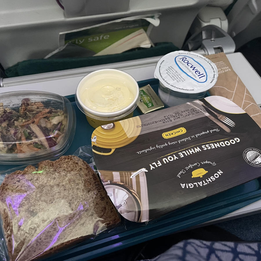 J’ai déjà dû le dire ici, mais le plateau repas de l’avion me réjouit toujours beaucoup. Ça veut dire départ, ça veut dire liberté, ça veut dire être tous les deux. Chaque opercule plastique détachée avec précaution, c’est un couvercle vers une aventure future. Le beurre trop froid qui ne s’étale pas sur la tartine décongelée, c’est l’annonce des petits déjeuners magiques qui nous attendent de pied ferme.