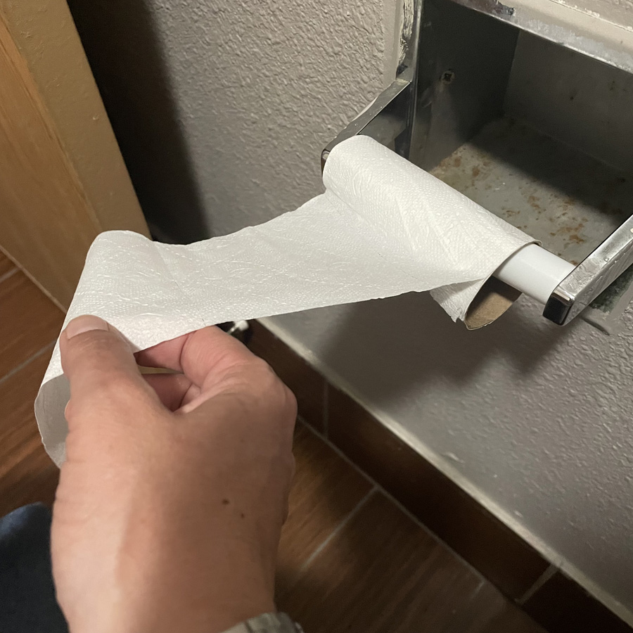 Il ne reste qu’une feuille de papier toilette, Manu va nous chercher ça parce que sinon, j’ai rien pour écraser les cafards.
