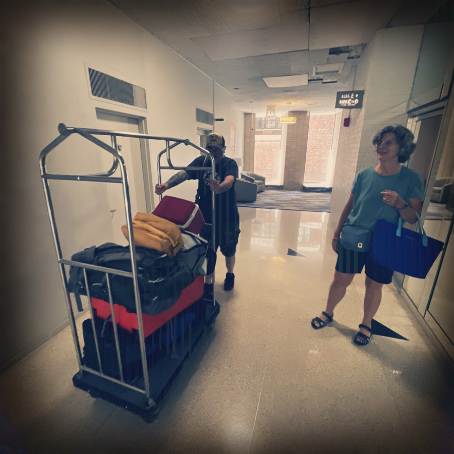 Jack fait du petit déjeuner, nous on fait des valises. C’est toujours mieux de faire des valises après des bons oeufs brouillés. On prend même le chariot à valises, on est chargé comme si on était la reine d’Angleterre. C’est un peu ridicule, mais on a pris le materiel pour camper, ça prend de la place, ça et les slips propres.
