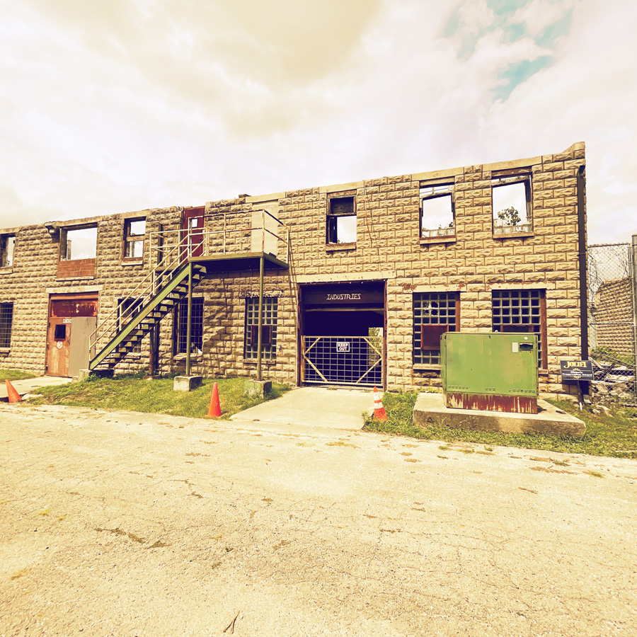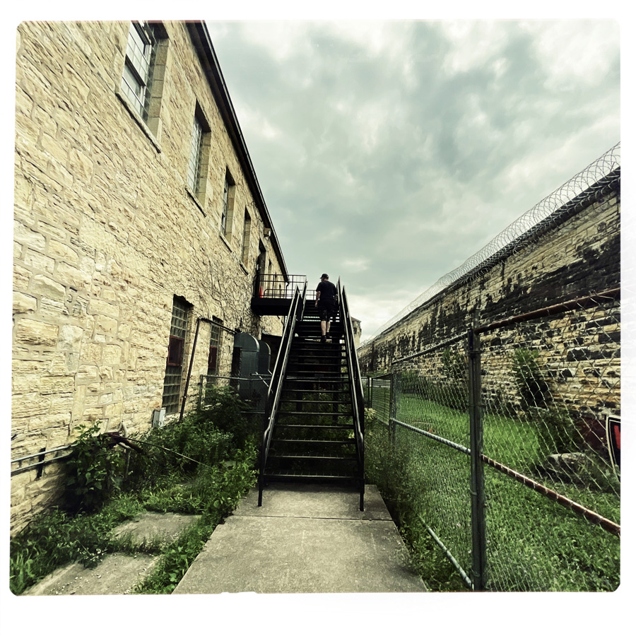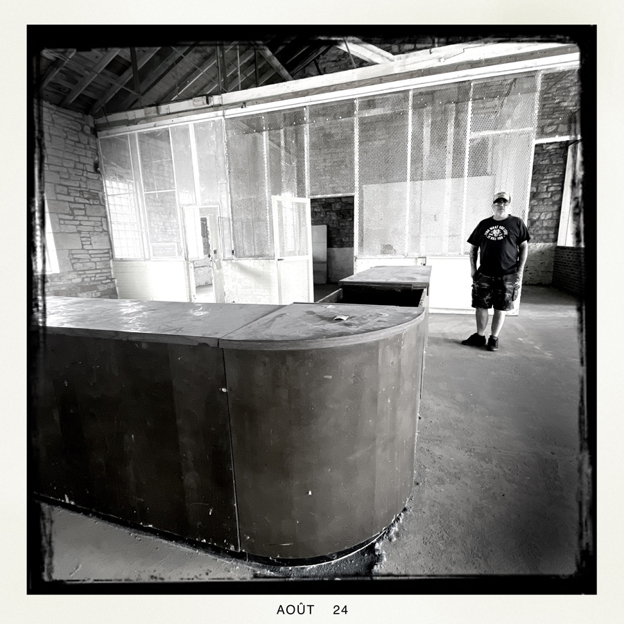 Tout est en travaux, mais le batiment est gigantesque. On trouve l’entrée du gift shop, on prend nos places, on fait des photos débiles. Pour l’instant, ce n’est pas hyper reel. D’ailleurs, la Prison de Joliet est assez déconcertante. C’est comme un décor de parc d’attraction, avec beaucoup de barbelés et qui tombe en ruine. On dirait presque un chateau.
