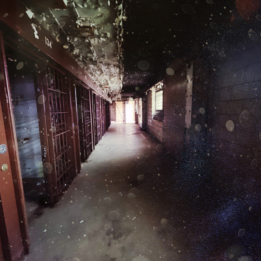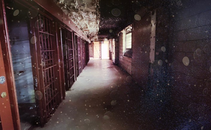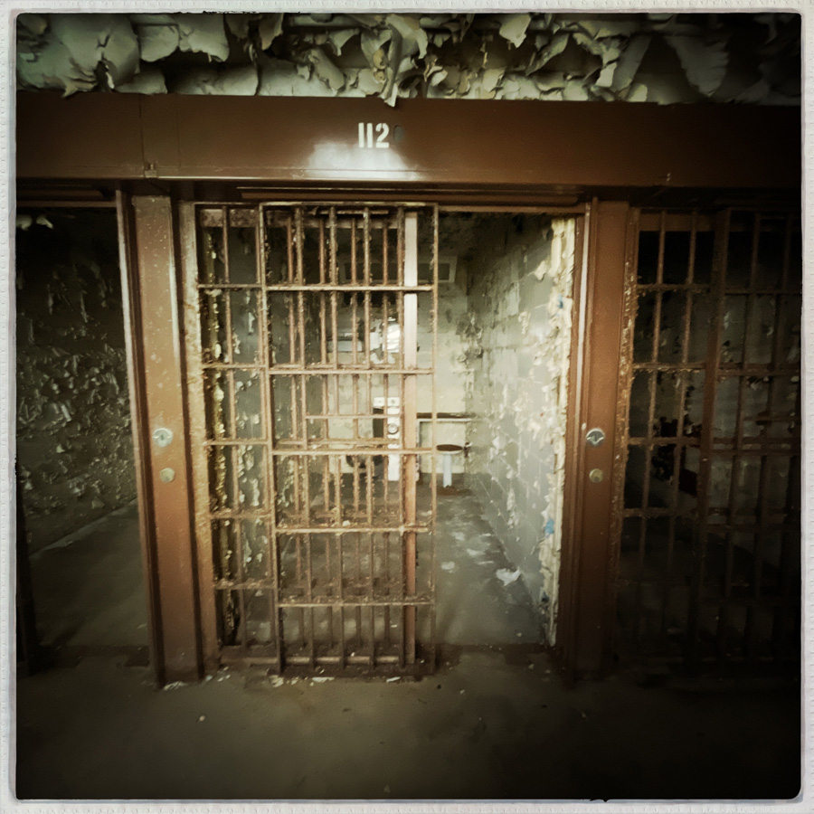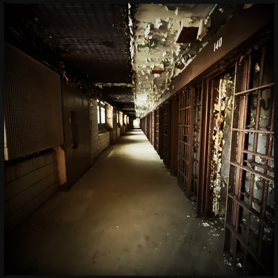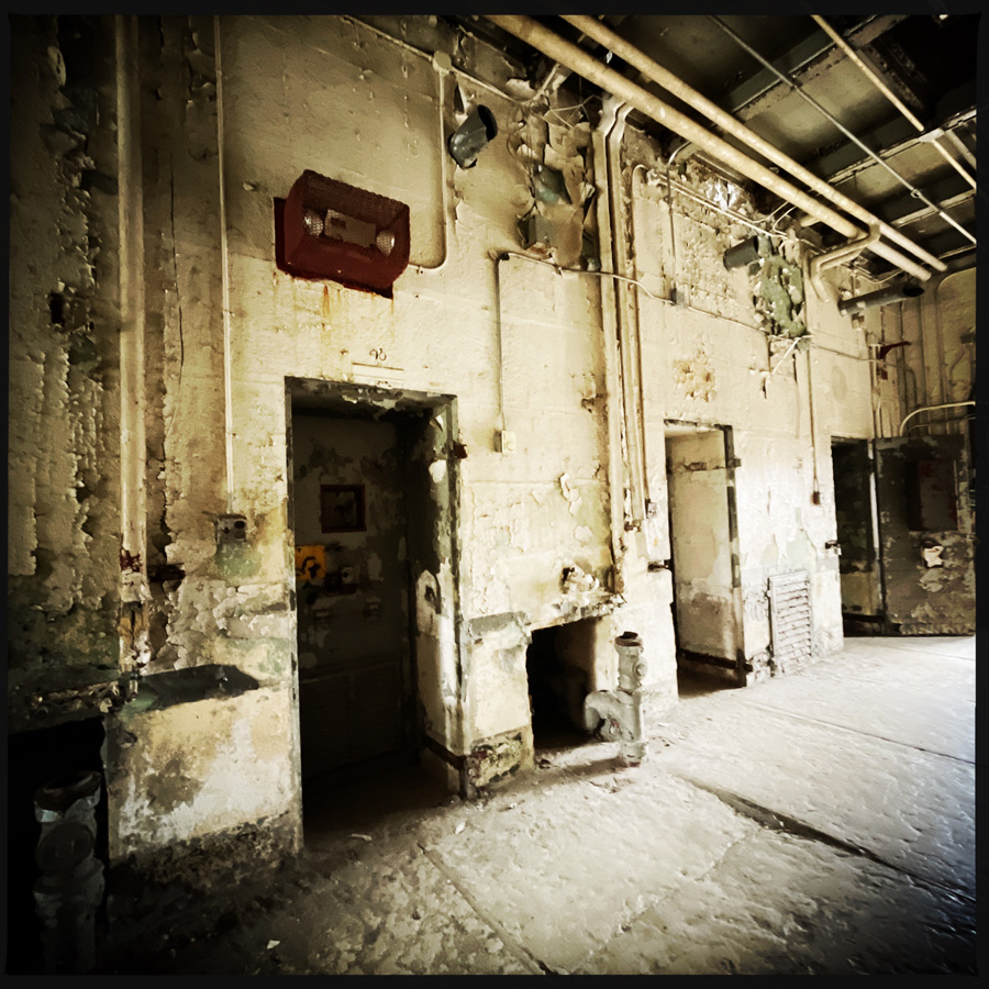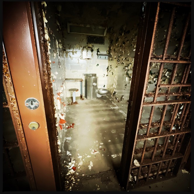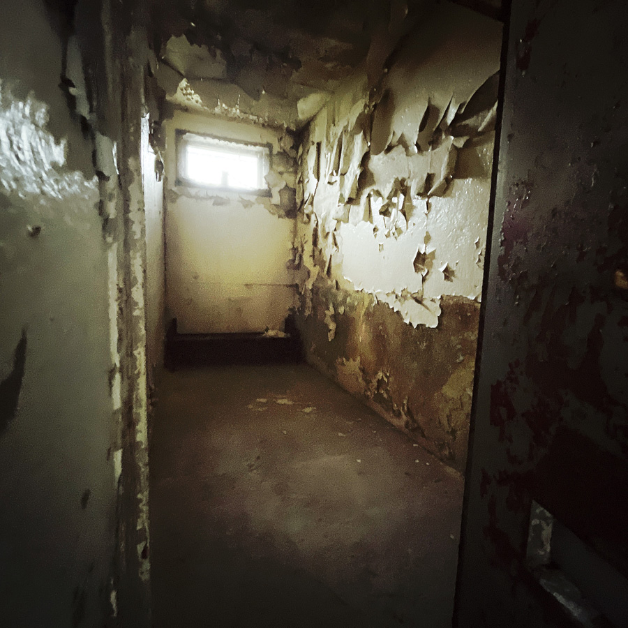 On visite des couloirs de cellules. La prison a fermé en 2002. En un peu plus de 20 ans, on est au delà de la vetusté. Les murs s’épluchent, il y a du verre cassé un peu partout. Tout est rouillé.