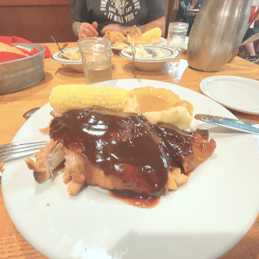 Puis on va manger. Un truc classique de campagne, très bien noté. C’est effectivement bon, et trop copieux, on repart avec des boites pour manger le reste demain.
