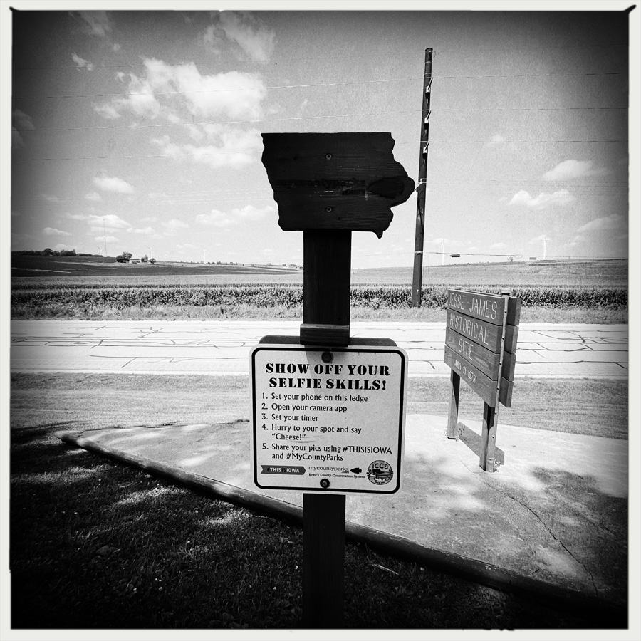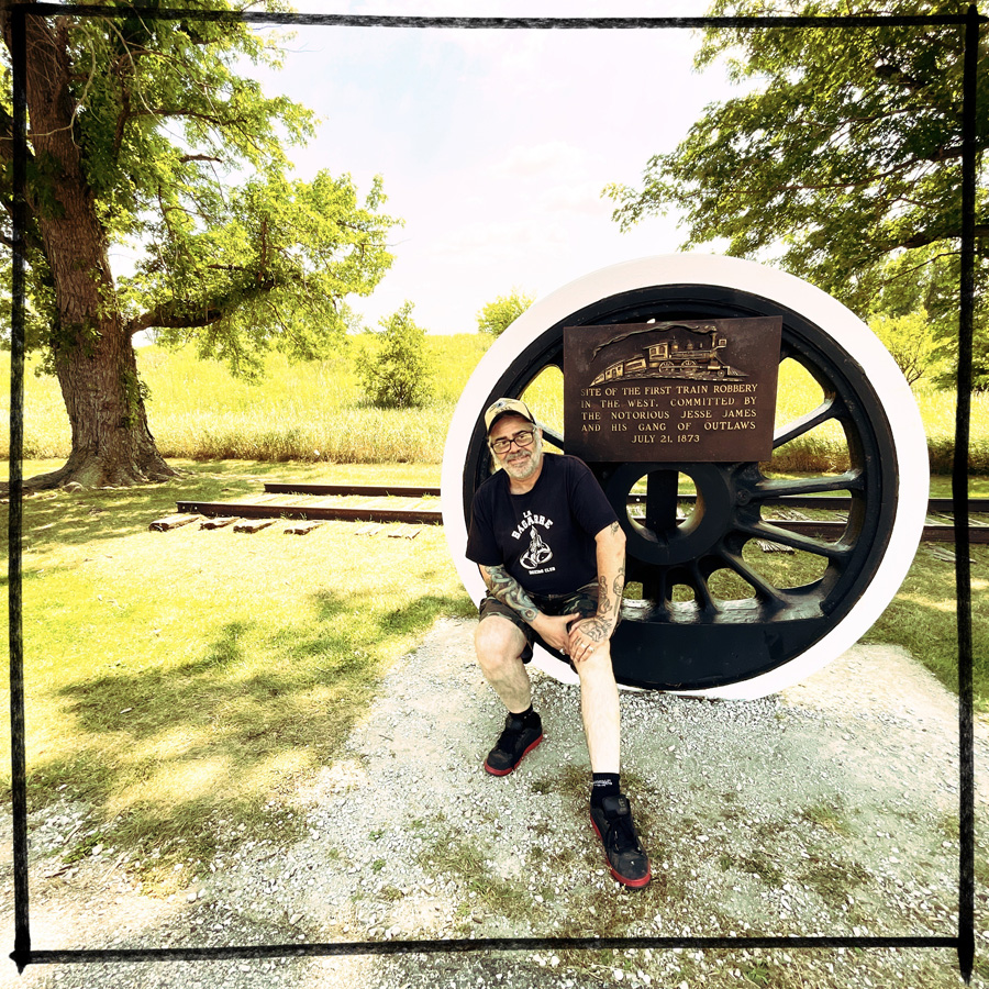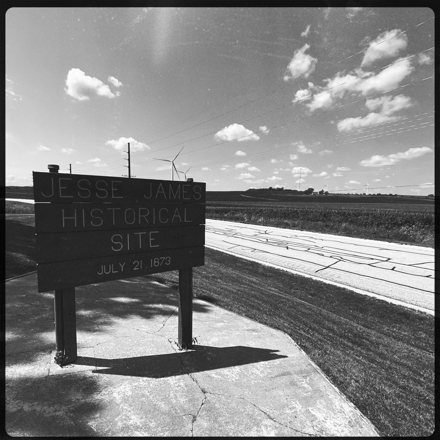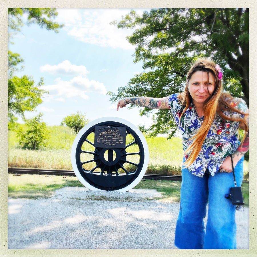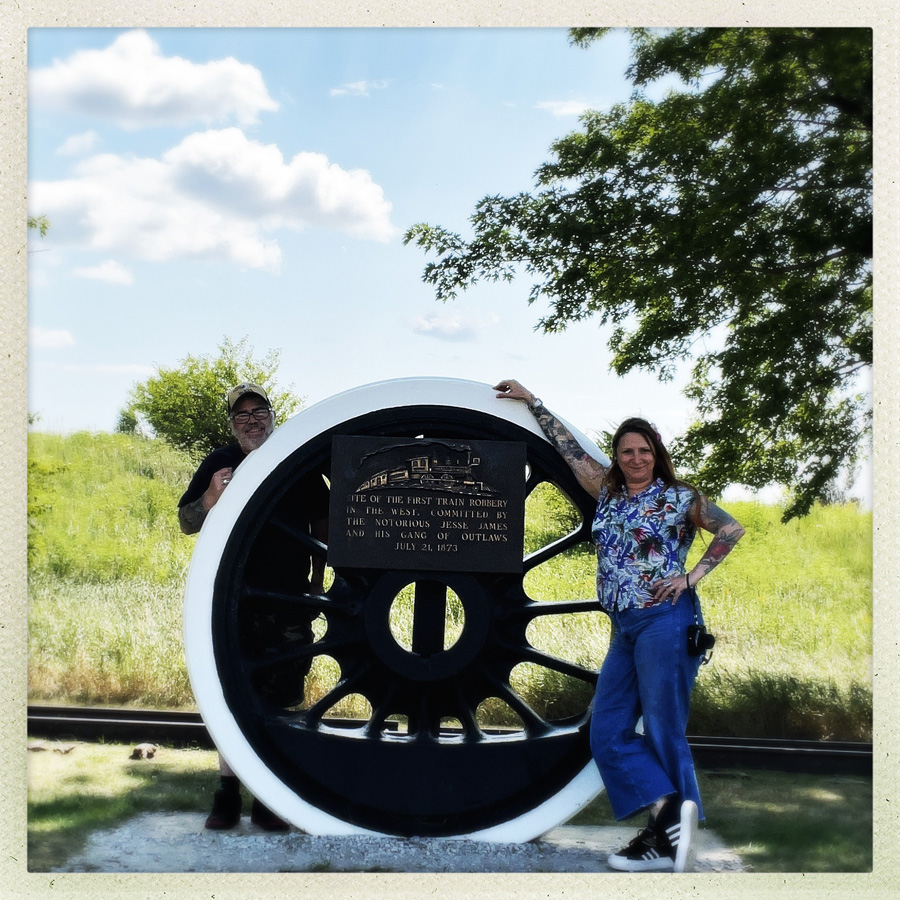 À Adair, il y a un monticule le long de la route, deux rails, une roue de train, et bordel à selfie. Mais quand même, c’est le lieu du tout permier braquage de train de Jesse James. Même si c’est un peu nul, c’est quand même cool.