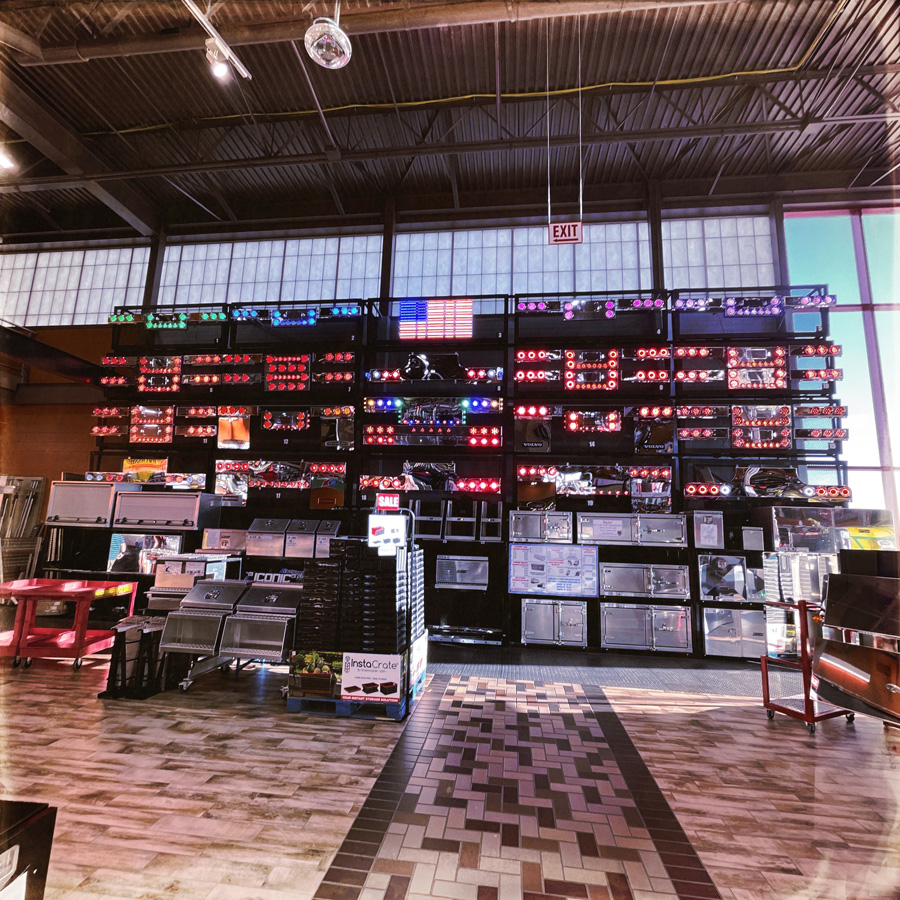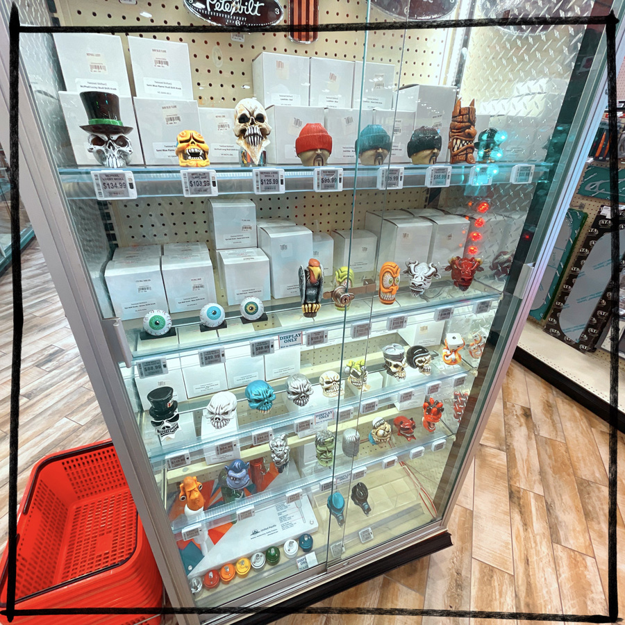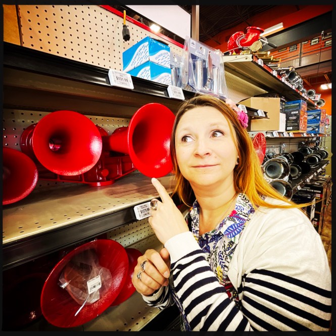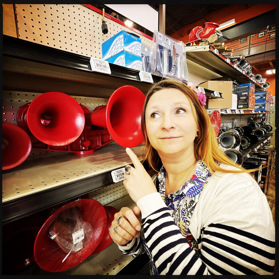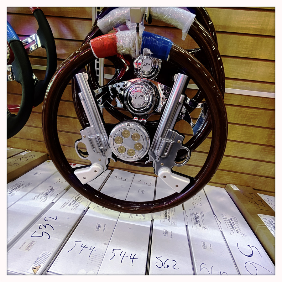 Zou, le panneau est énorme, c’est inloupable. On entre. Figurez-vous que je pense que c’est bel et bien le plus grand truck stop du monde. C’est comme un supermarché géant, avec des tas de thématiques, jouets, chasse et pêche, gateaux, heroic fantasy (si, si), camion (pouet pouet). On rit beaucoup de l’absurdité de l’endroit, mais tout de même, le bouquet final, c’est la partie tunning pour camion où tout existe. Volants à paillettes, klaxon multi-fonctions, pots d’échappement géants, et lumières qui clignotent dans tous les sens. J’ai envie de tout prendre en photo, mais les conducteurs de camion ont l’air mitigé que ça me fasse autant rigoler.