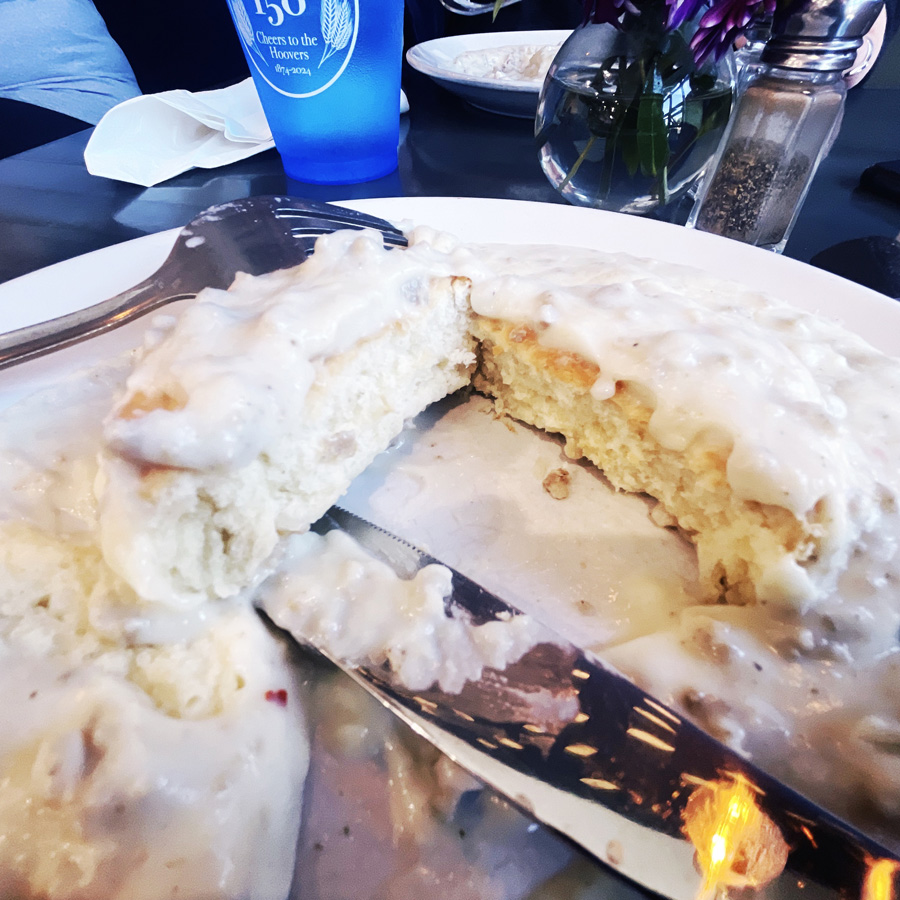 On repart, et après tergiversation, on se dit qu’un petit déjeuner serait tout de même le bienvenue. Je trouve un endroit qui fait ça dans LA ville du président Hoover. Et ce weekend, il aurait eu 150 ans. Alors la ville est en fête. mais comme il est très tôt, la fête est encore molle. L’endroit du petit déjeuner est formidable. Je l’ai choisi parce que… parce que… ils ont du… du… BISCUITS AND GRAVY !