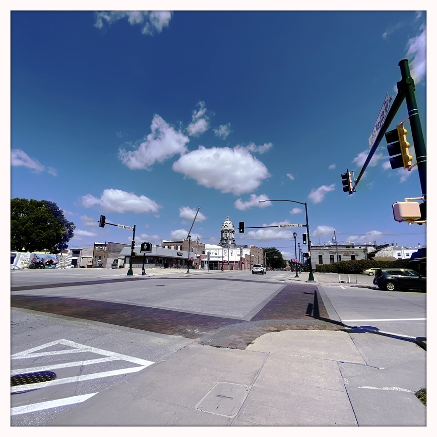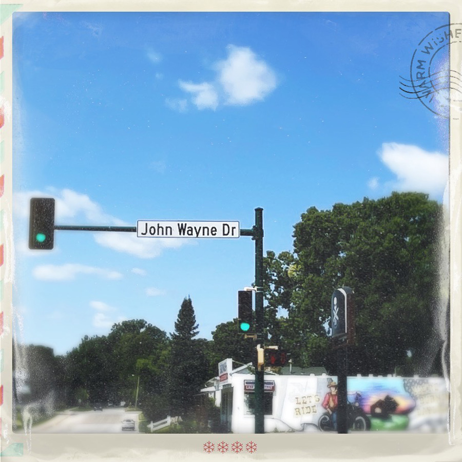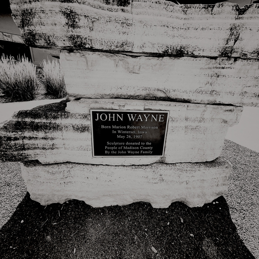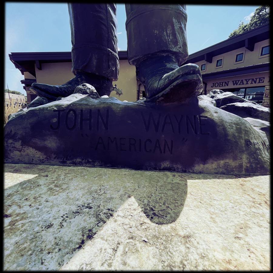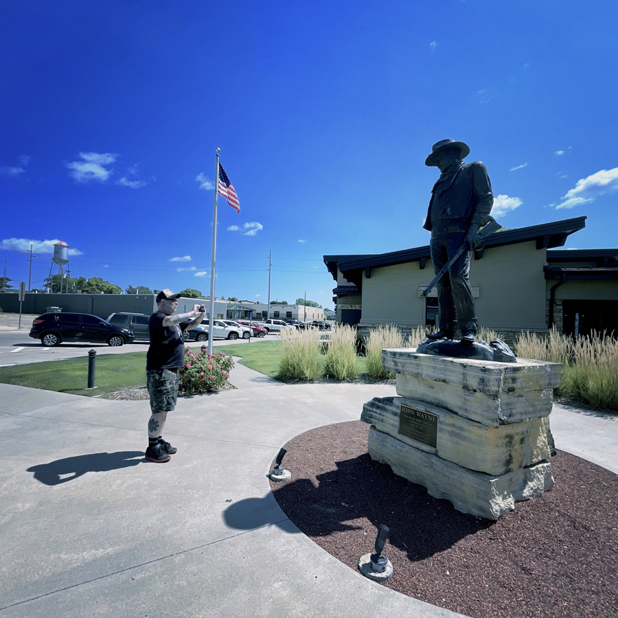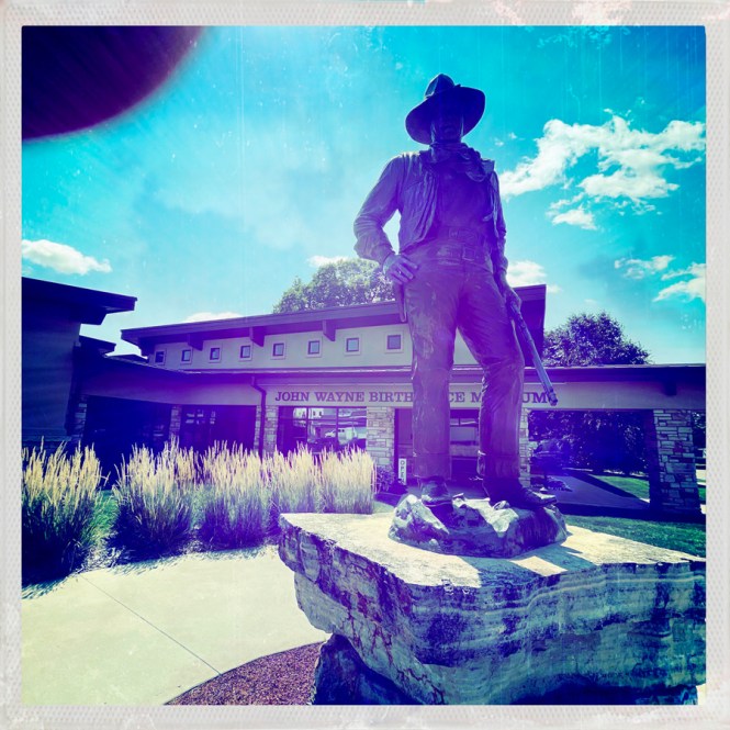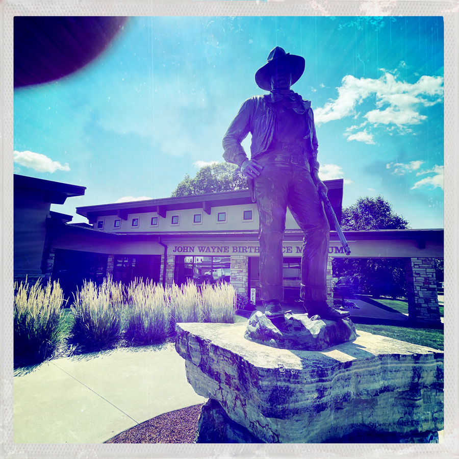 On a pas loin de 480 km aujourd’hui, mais on s’autorise des petites folies. Direction Winterset, le lieu de naissance de John Wayne. On roule sur John Wayne Drive. Et on est accuelli par une statue de John Wayne, devant le musée John Wayne. Je crois que c’est là.