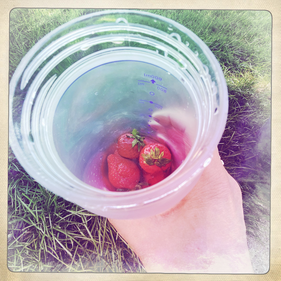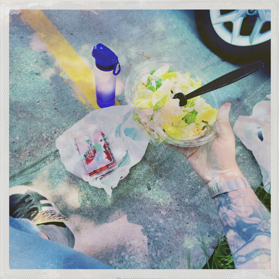 On a encore de la route. Je dodeline un peu (= je m’endors régulièrement). On s’arrête au supermarché, je prends une salade et des fraises, Manu une salade de macaronis et un cookie (je balance, yolo.).