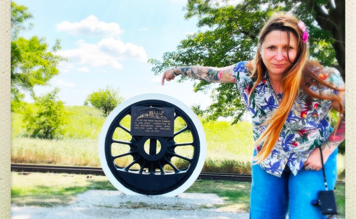 À Adair, il y a un monticule le long de la route, deux rails, une roue de train, et bordel à selfie. Mais quand même, c’est le lieu du tout permier braquage de train de Jesse James. Même si c’est un peu nul, c’est quand même cool.