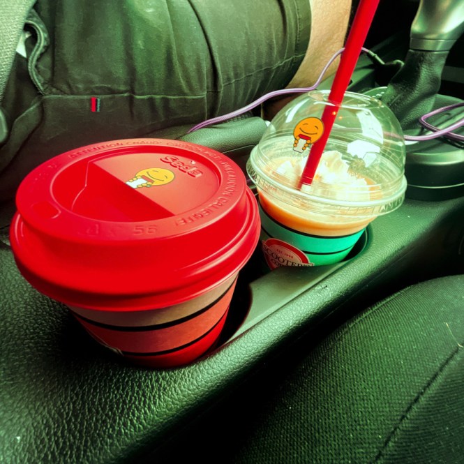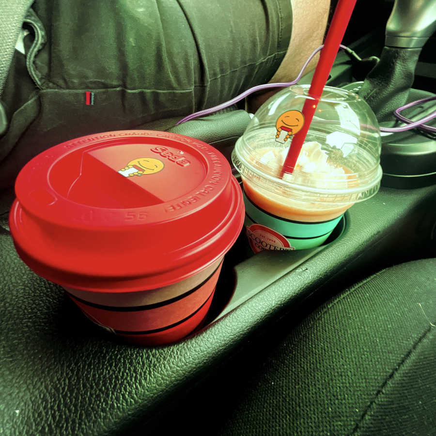 On s’arrête dans un drive thru pour que je prenne un café, j’opte pour un Chai tea latte. Je demande si c’est sucré, on me dit « Oh non, pas trop », et bien c’était comme un thé à la barbapapa. J’ai probablement 34 nouvelles caries. Ils sont fada.