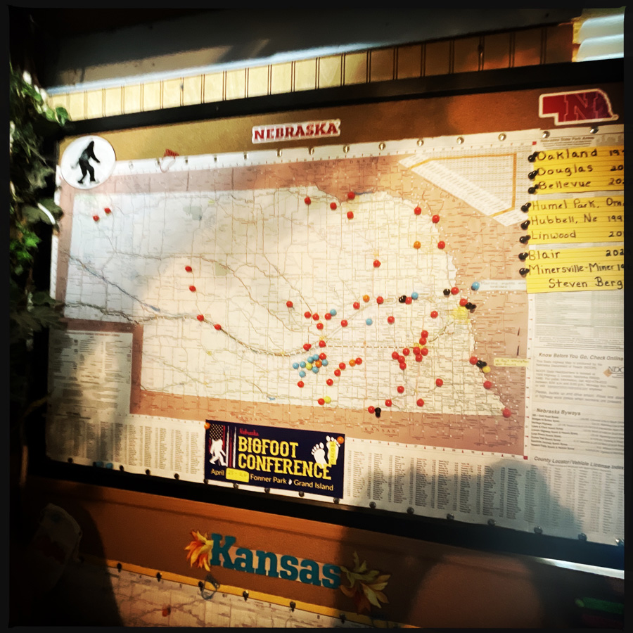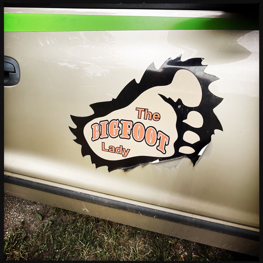 Elle brandit une canne en bois tournicoté et des arguments « scientifiques ». Les Bigfoot aiment le sel et l’eau. Pour en trouver (je vous file les trucs si vous voulez partir en quête.). Elle commence toujours ses recherches en googlant les marais salants. C’est LE point de départ. Bigfoot aime le sel. Ensuite ils aiment les rivières. Elle nous pointe une carte avec sa canne en bois : les points rouges : c’est là qu’on les a vu (oui y’a plein de Bigfoot, ils vivent en famille). Ils mangent des cerfs, des tas d’autres animaux et en été des fruits des jardins. Si y’a des zones où y’a pas de signalement, c’est parce que les villes sont trop petites, alors les gens n’osent pas. Et en plus, les journaux des bleds ont disparu, alors l’information ne circule pas. Eeeet ouais.