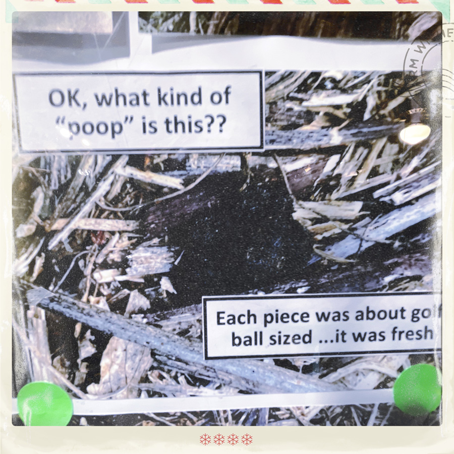 Et après, ça devient sérieux : une pile de branches en vrac : « Ils construisent cet habitat. Aucun humain n’a touché à ça. Ils viennent la nuit. Moi j’en ai vu un quand j’avais 12 ans, j’espère en revoir un bientôt. »