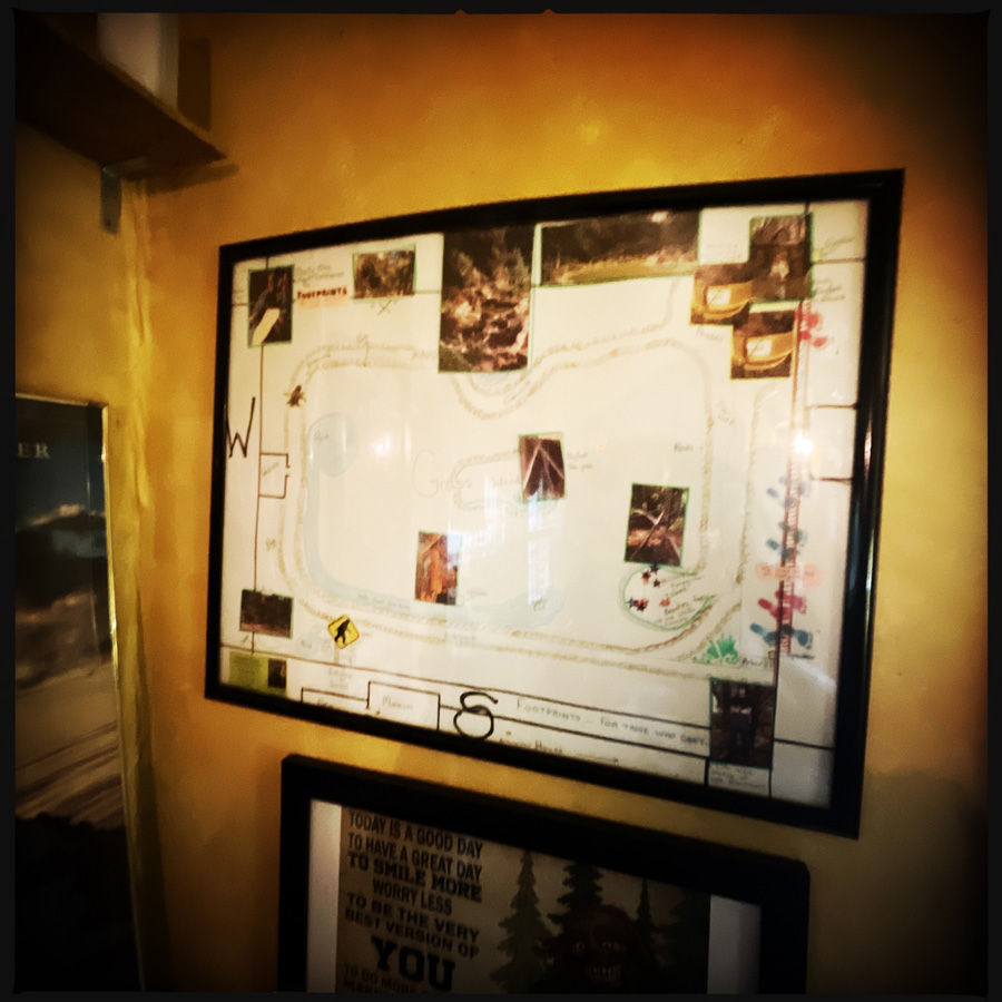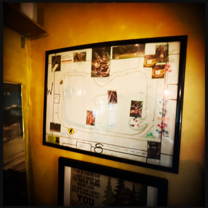 Il parle d’Harriet avec une admiration inouïe. Dans la cabane suivante, là c’est vraiment l’apothéose du n’imp. Il nous montre un papier encadré avec un plan du jardin, comme si ça avait été dessiné par un enfant. Mais non, c’est la vision de Harriet. Elle rêvé de ce jardin une nuit et l’a dessiné. Scott construit.