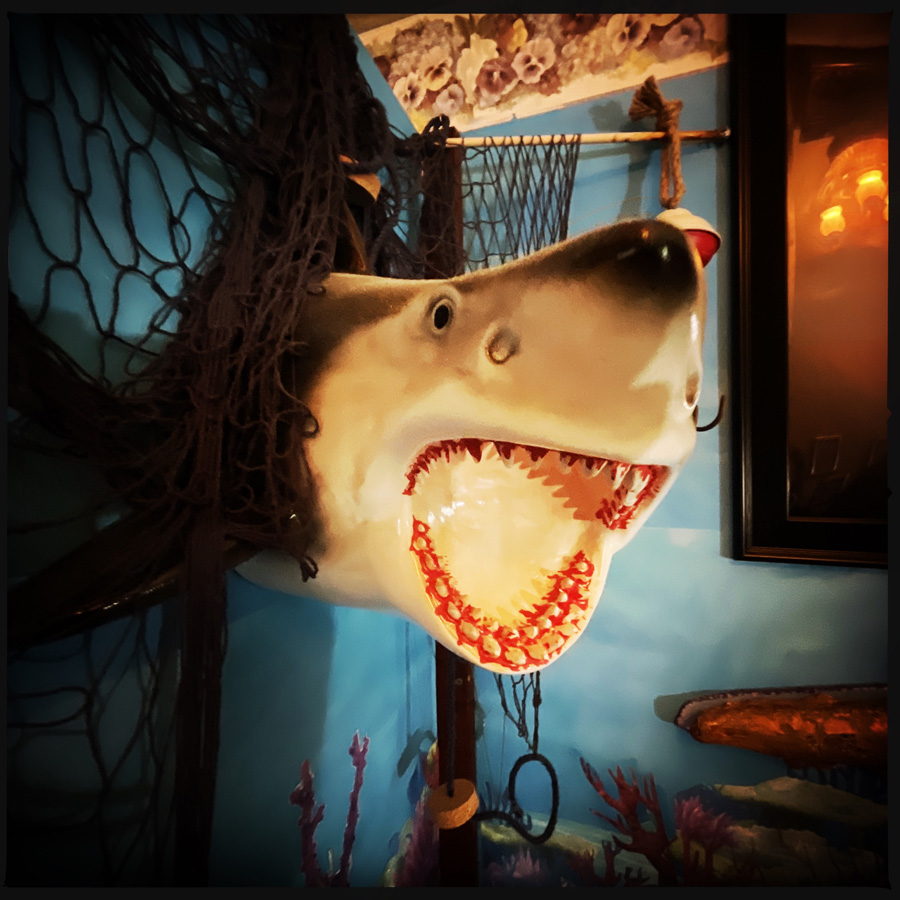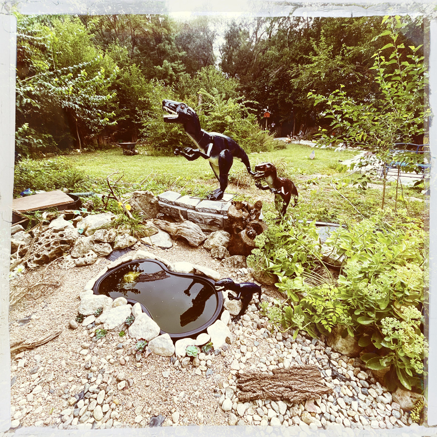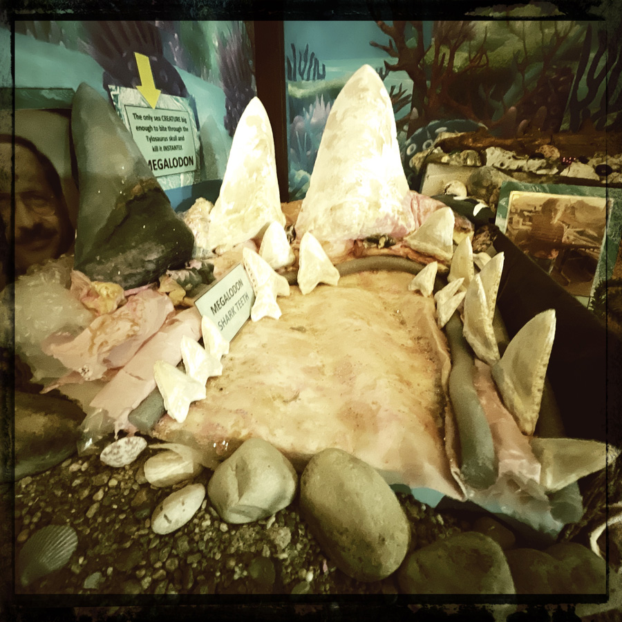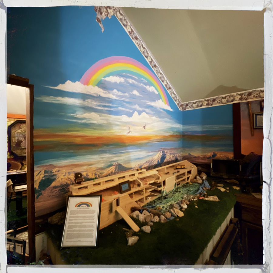 Puis une autre pièce, avec une représentation de l’arche de Noé. Et des dinosaures. Et des requins. J’avoue qu’on est perdu. On lit les panneaux, mais Scott qui a beaucoup de boulot nous reconduit vers la porte. Manu part fumer une clope et je continue la visite car dans le jardin, y’a aussi des dinosaures en métal, une autre fontaine en construction, et des cailloux qui représentent ses enfants (pas morts), et des statues pour ses animaux (morts). (Sont-ils enterrés là ? Je ne sais pas).