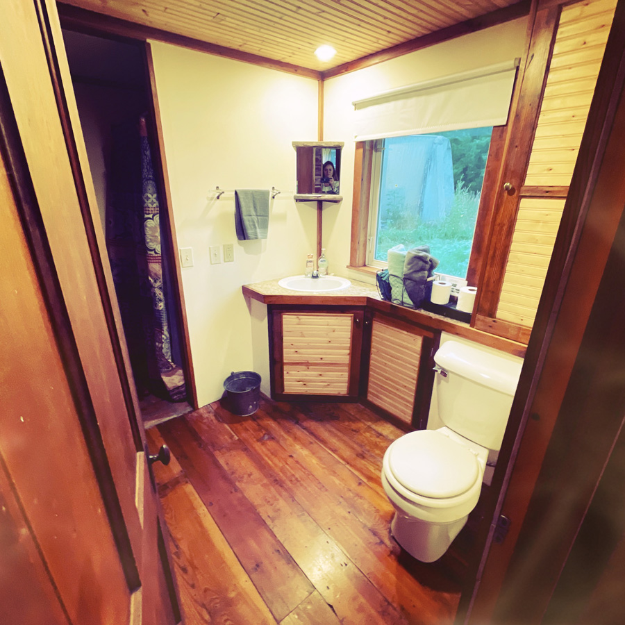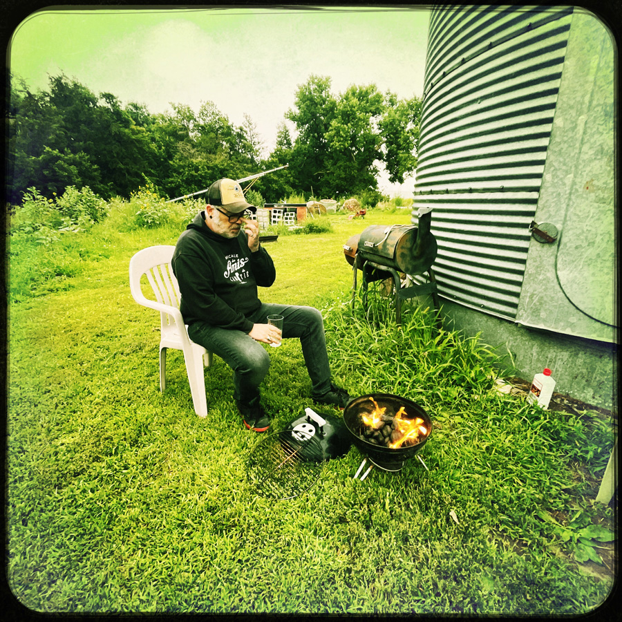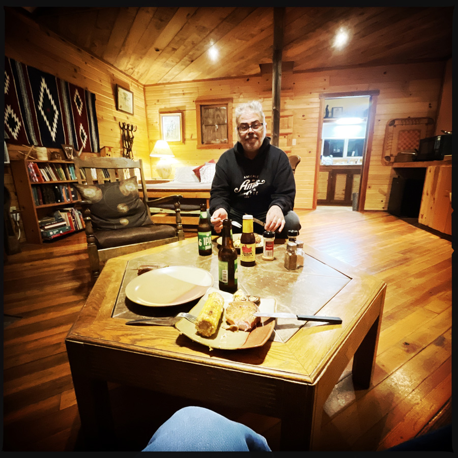 On discute un peu, et c’est sympa. Il nous a sorti un barbecue minus, mais ça va, on a deux bouts de cochon à faire griller et des champignons farcies. C’était sans compter que le charbon serait humide et qu’il allait se mettre à pleuvoir très fort. On a rallumé le BBQ au moins 12 fois avec de l’essence. Je refuse d’être humiliée genre on sait même pas faire un BBQ. Mais comment voulez-vous que je bosse avec du charbon humide ? Mon côté mâle alpha a la couille qui gratte. J’ai finalement terminé la cuisson à la poêle sur le petit réchaud de la cabane. Ce diner était délicieux.