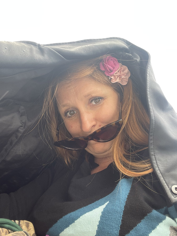 Je me planque sous mon blouson en cuir de plastique. Mon jean s’imprègne doucement. C’est glacé, c’est de la pluie montagne. Très vite, un arc-en-ciel, et puis deux. C’est très beau mais on a très froid. Tous les bancs sont trempés, quand les gens arrivent, il faut faire un peu de ménage.